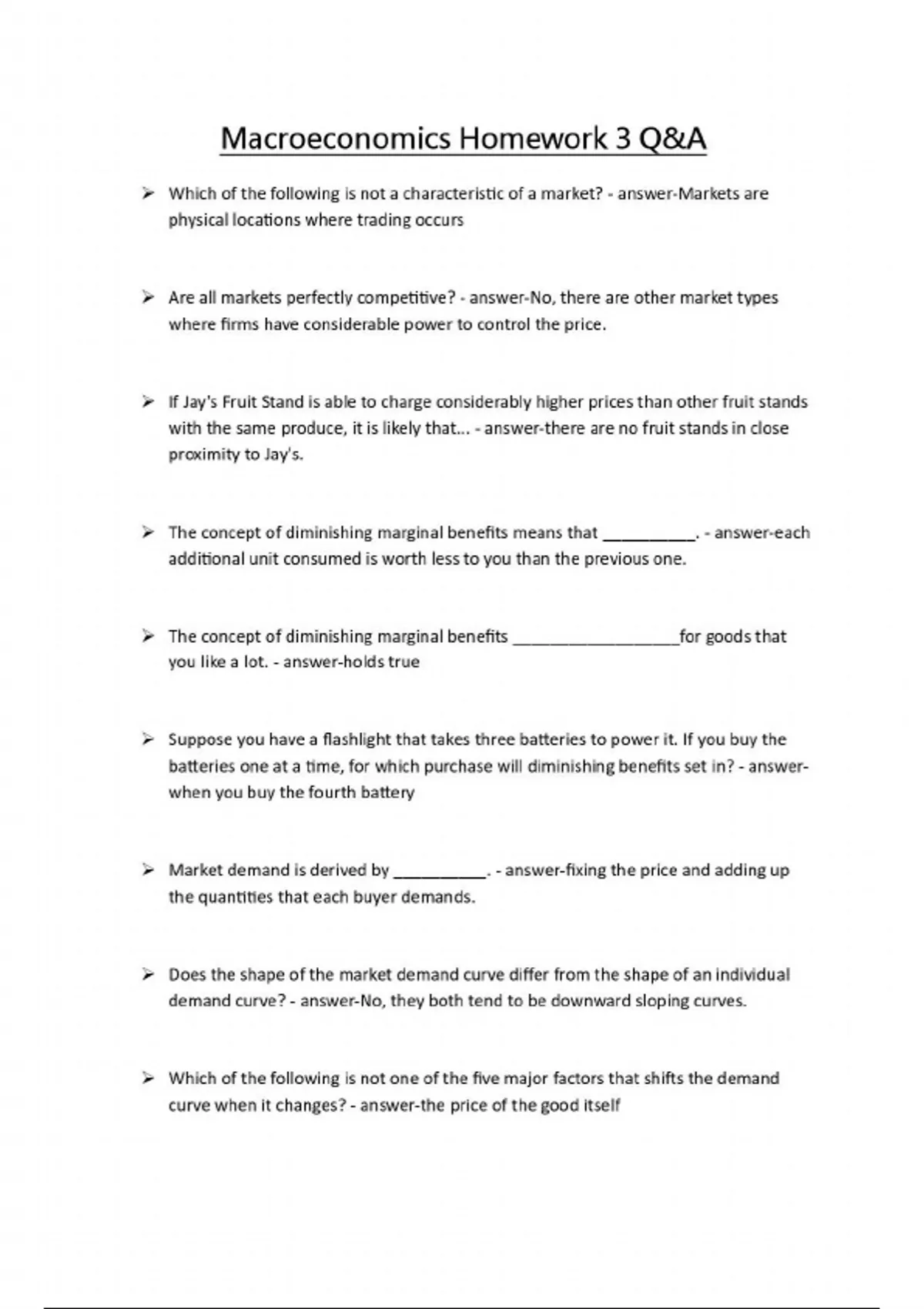 Macroeconomics Homework 3 Q&A Which of the following is not a characteristic of a market? - answer-Markets are physical locations where trading occurs Are all markets perfectly competitive? - answer-No, there are other market types where firms have considerable power to control the price. If Jay's Fruit Stand is able to charge considerably higher prices than other fruit stands with the same produce, it is likely that... - answer-there are no fruit stands in close proximity to Jay's. The concept of diminishing marginal benefits means that __________. - answer-each additional unit consumed is worth less to you than the previous one. The concept of diminishing marginal benefits __________________for goods that you like a lot. - answer-holds true Suppose you have a flashlight that takes three batteries to power it. If you buy the batteries one at a time, for which purchase will diminishing benefits set in? - answer-when you buy the fourth battery Market demand is derived by __________. - answer-fixing the price and adding up the quantities that each buyer demands. Does the shape of the market demand curve differ from the shape of an individual demand curve? - answer-No, they both tend to be downward sloping curves. Which of the following is not one of the five major factors that shifts the demand curve when it changes? - answer-the price of the good itself...