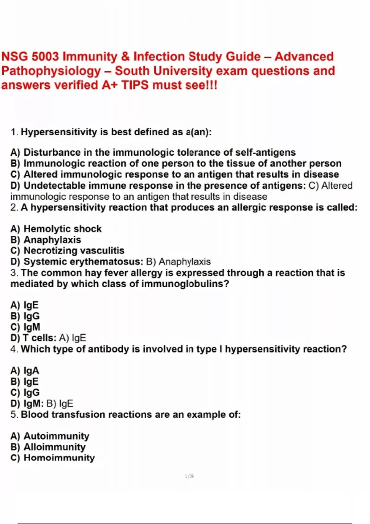 NSG 5003 Immunity & Infection Study Guide – Advanced Pathophysiology – South University exam questions and answers verified A+ TIPS must see!!!.pdf