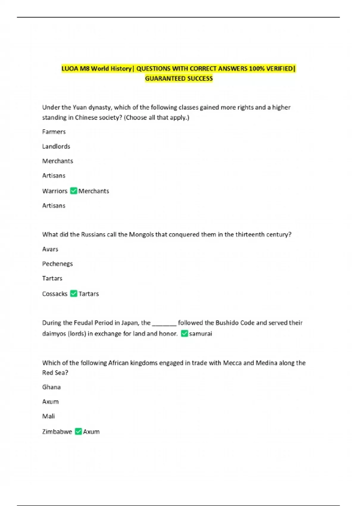 LUOA M8 World History| QUESTIONS WITH CORRECT ANSWERS 100% VERIFIED| GUARANTEED SUCCESS