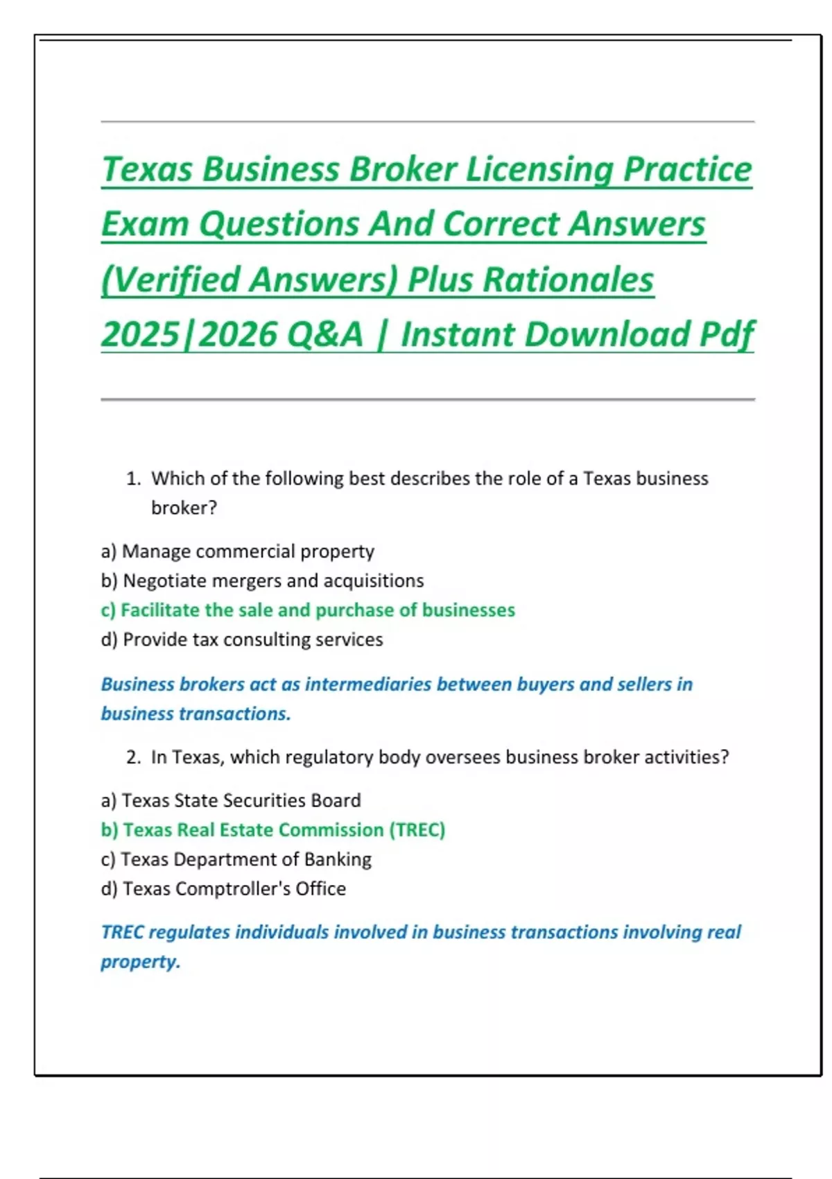 Texas Business Broker Licensing Practice Exam Questions And Correct Answers (Verified Answers) Plus Rationales 2025|2026 Q&A | Instant Download Pdf
