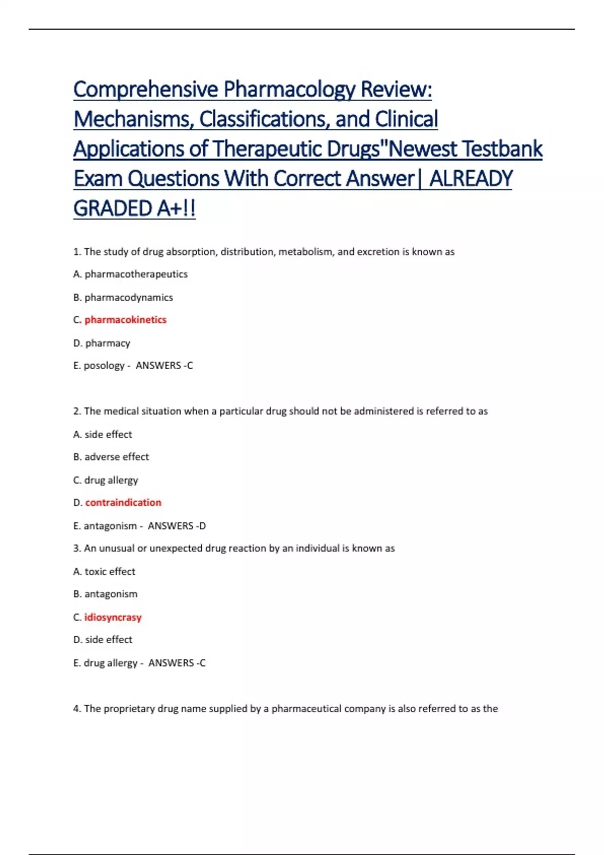 Comprehensive Pharmacology Review: Mechanisms, Classifications, and Clinical Applications of Therapeutic Drugs"Newest Testbank Exam Questions With Correct Answer| ALREADY GRADED A+!!