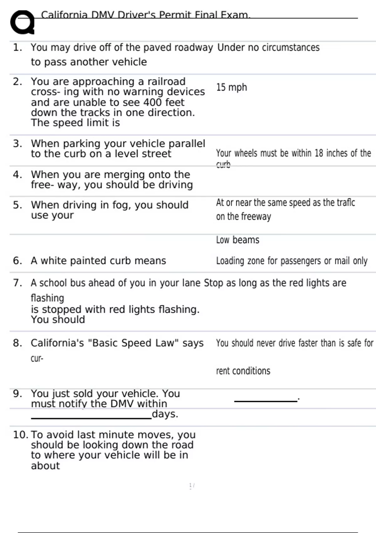 California DMV Driver's Permit Final Exam. 1. You may drive off of the paved roadway Under no circumstances to pass another vehicle 2. You are approaching a railroad cross- ing with no warning devices and are unable to see 400 feet down the tracks in one direction. The speed limit is 3. When parking your vehicle parallel to the curb on a level street 4. When you are merging onto the free- way, you should be driving 5. When driving in fog, you should use your 15 mph Your wheels must be within 18 inches of the curb At or near the same speed as the traflc on the freeway Low beams 6. A white painted curb means Loading zone for passengers or mail only 7. A school bus ahead of you in your lane Stop as long as the red lights are flashing is stopped with red lights flashing. You should 8. California's "Basic Speed Law" says You should never drive faster than is safe for cur- rent conditions 9. You just sold your vehicle. You must notify the DMV within days. 10. To avoid last minute moves, you should be looking down the road to where your vehicle will be in about . 5 10 to 15 seconds 11. You are about to make a left turn. You must signal continuously during the last feet before the turn. 100 12. True or False: Large trucks have bigger True blind spots than most passenger vehi- cles? 13. You have been involved in a minor traf- Leave a note on the vehicle and report the accident fic collision with a parked vehicle and you can't find the owner. You must without delay to the city police or, in unincorporat- ed areas, to the CHP. 14. Unless otherwise posted the speed lim- 25 mph it in a residential area is . 15. You may legally block an intersection Under no circumstances 16. When parking uphill on a two-way street with no curb, your front wheels should be 17. With a Class C drivers license a person may drive 18. To turn left from a multilane one-way street onto a one-way street, you should start your turn from 19. If you are involved in a traffic collision, you are required to complete and sub- mit a written report (SR1) to the DMV