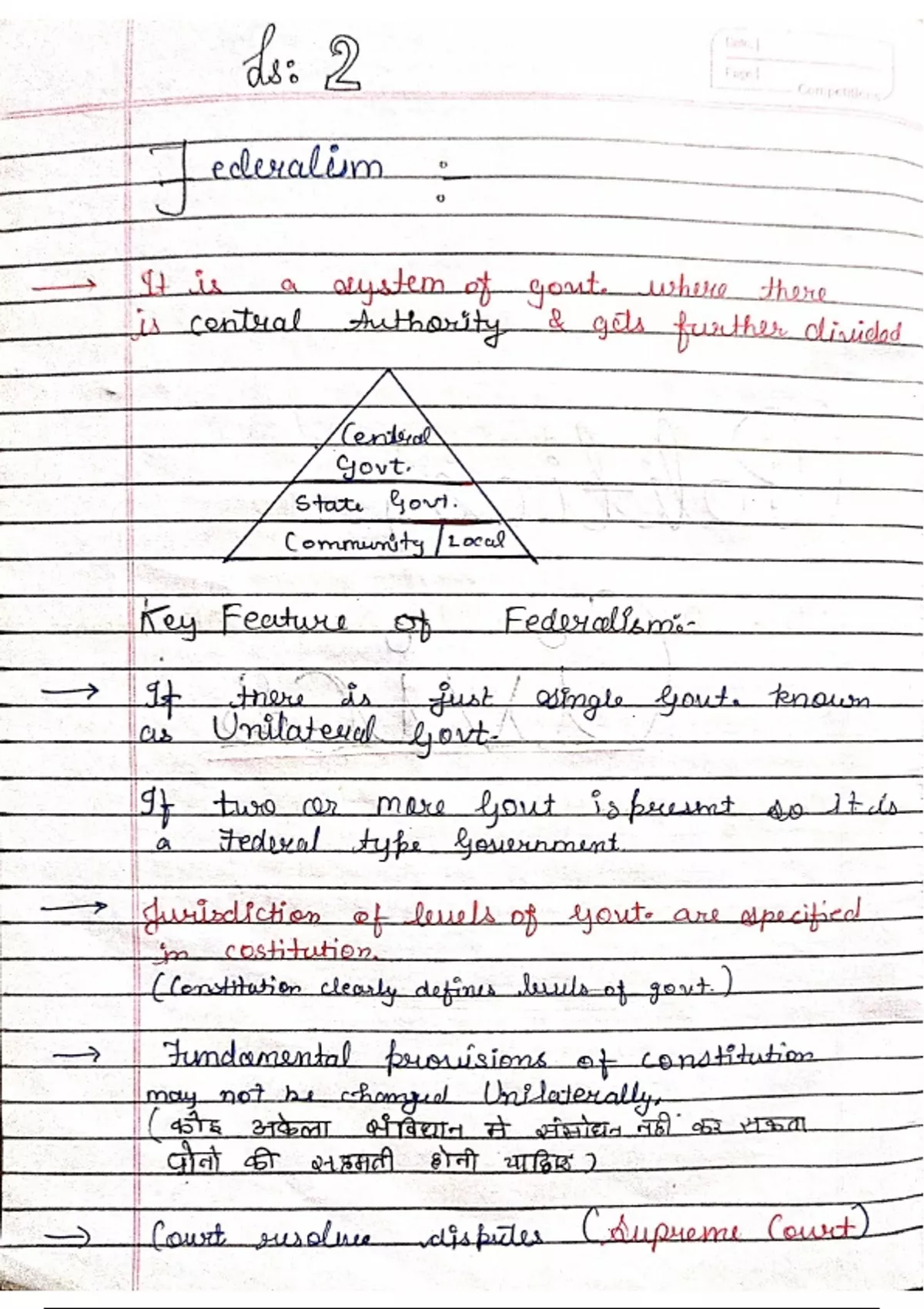 Class 9 political science lesson 2 federalism handwritten cbse ncert notes with easy explanation