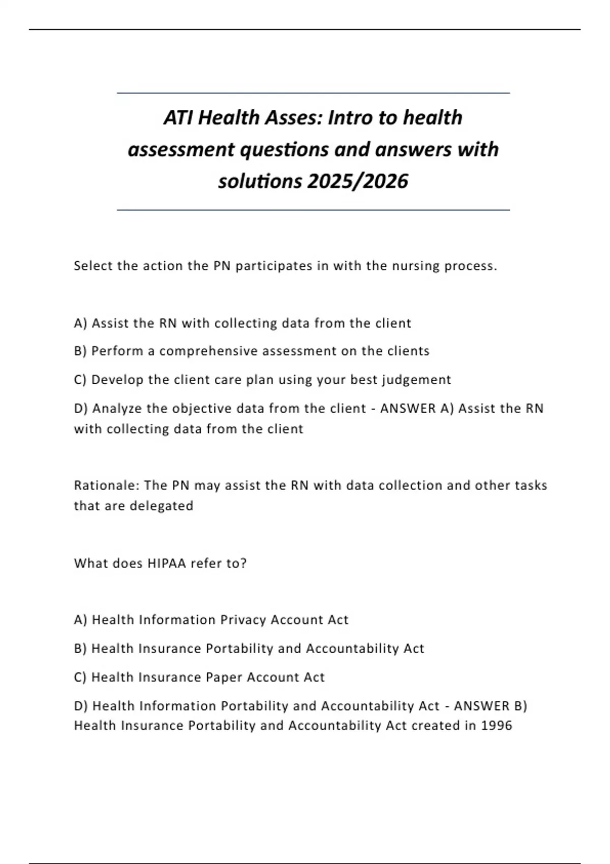 ATI Health Asses: Intro to health assessment questions and answers with solutions 2025/2026
