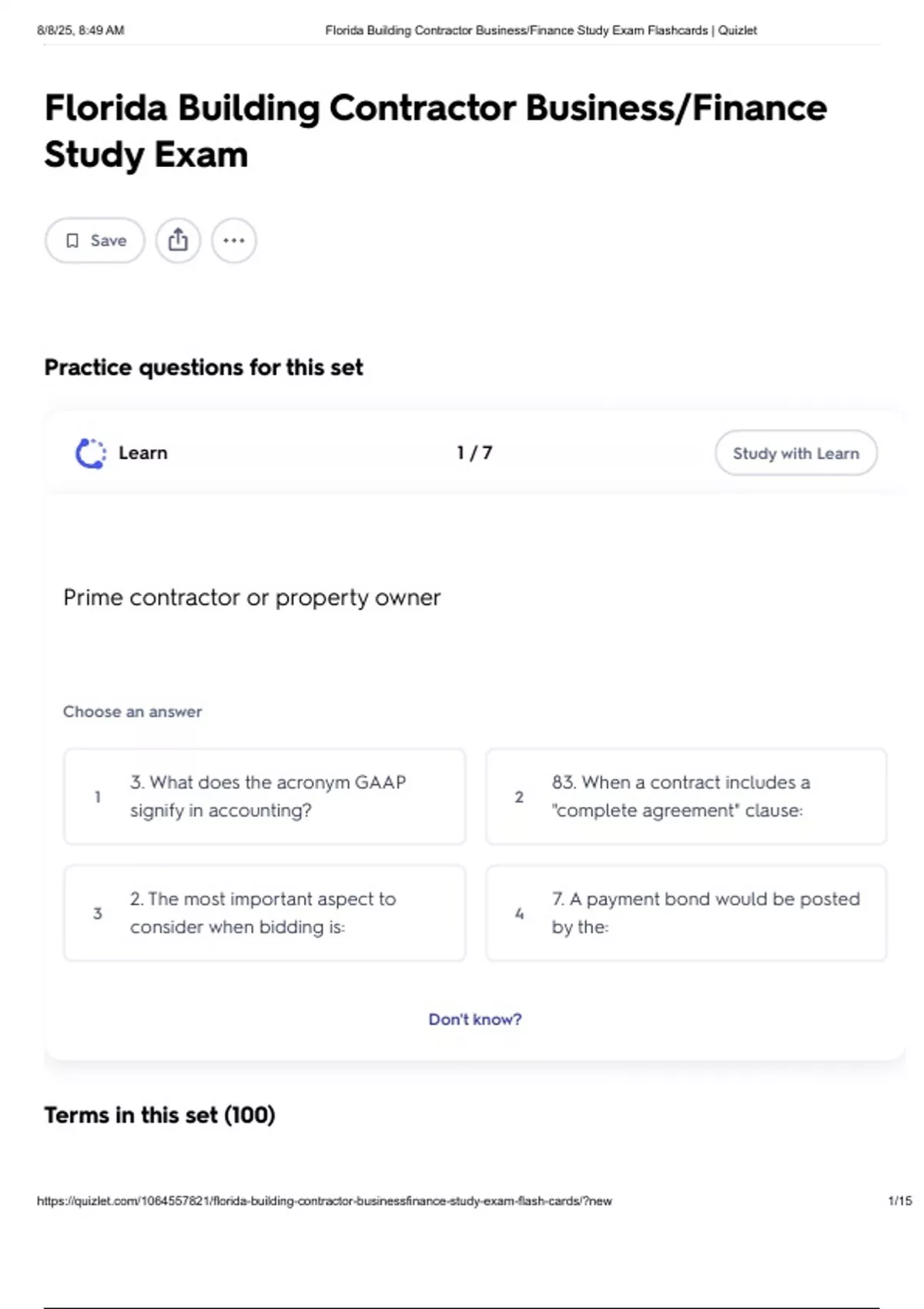 8/8/25, 8:49 AM Florida Building Contractor Business/Finance Study Exam Flashcards | Quizlet