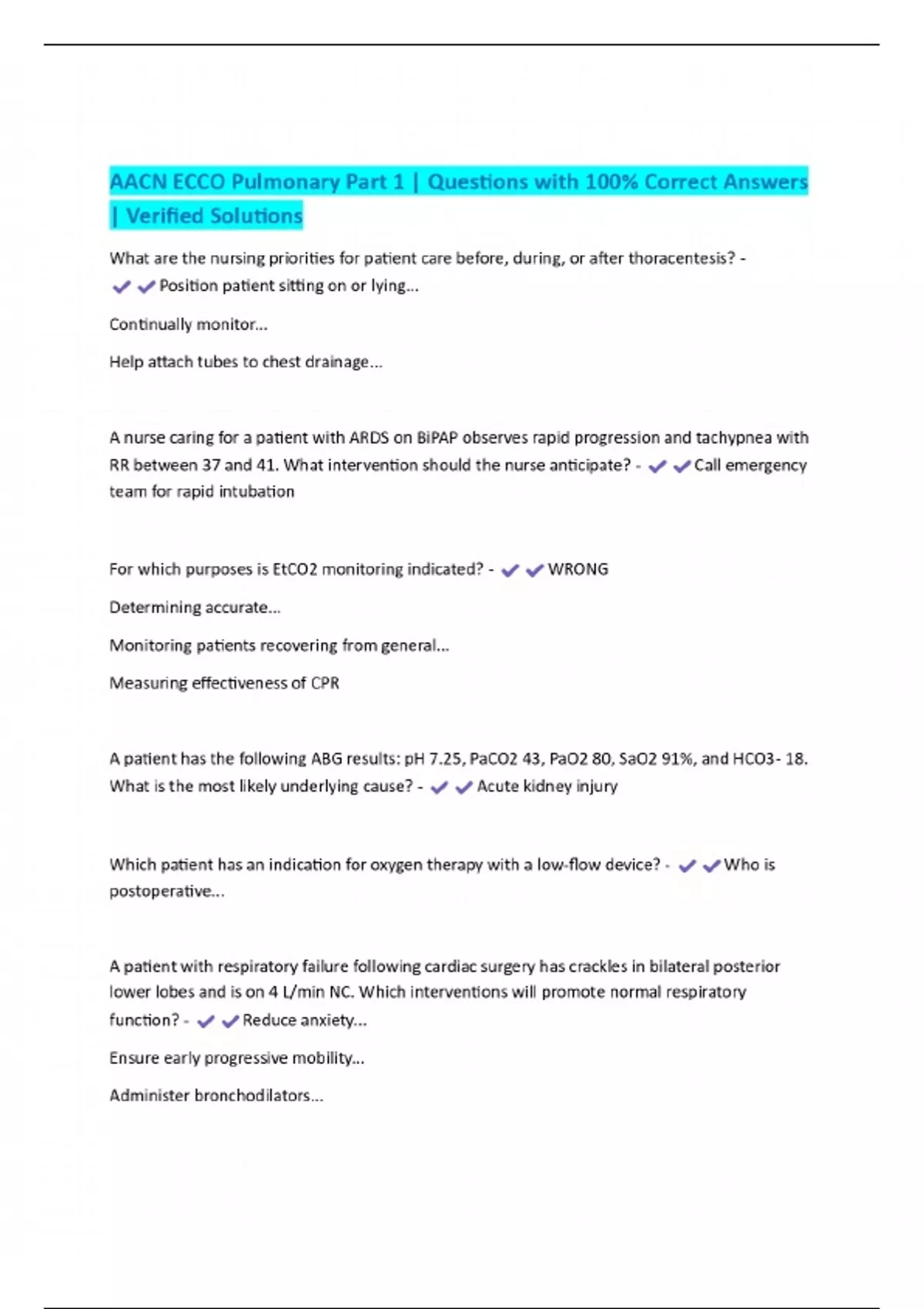 AACN ECCO Pulmonary Part 1 | Questions with 100% Correct Answers | Verified Solutions