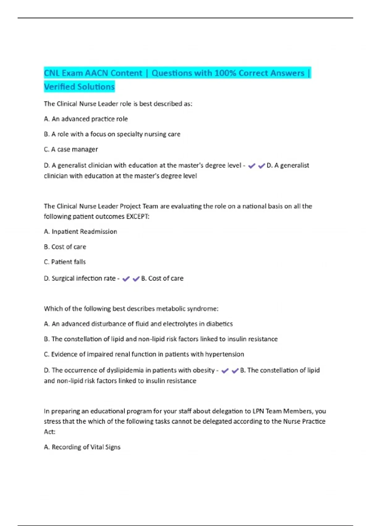 CNL Exam AACN Content | Questions with 100% Correct Answers | Verified Solutions