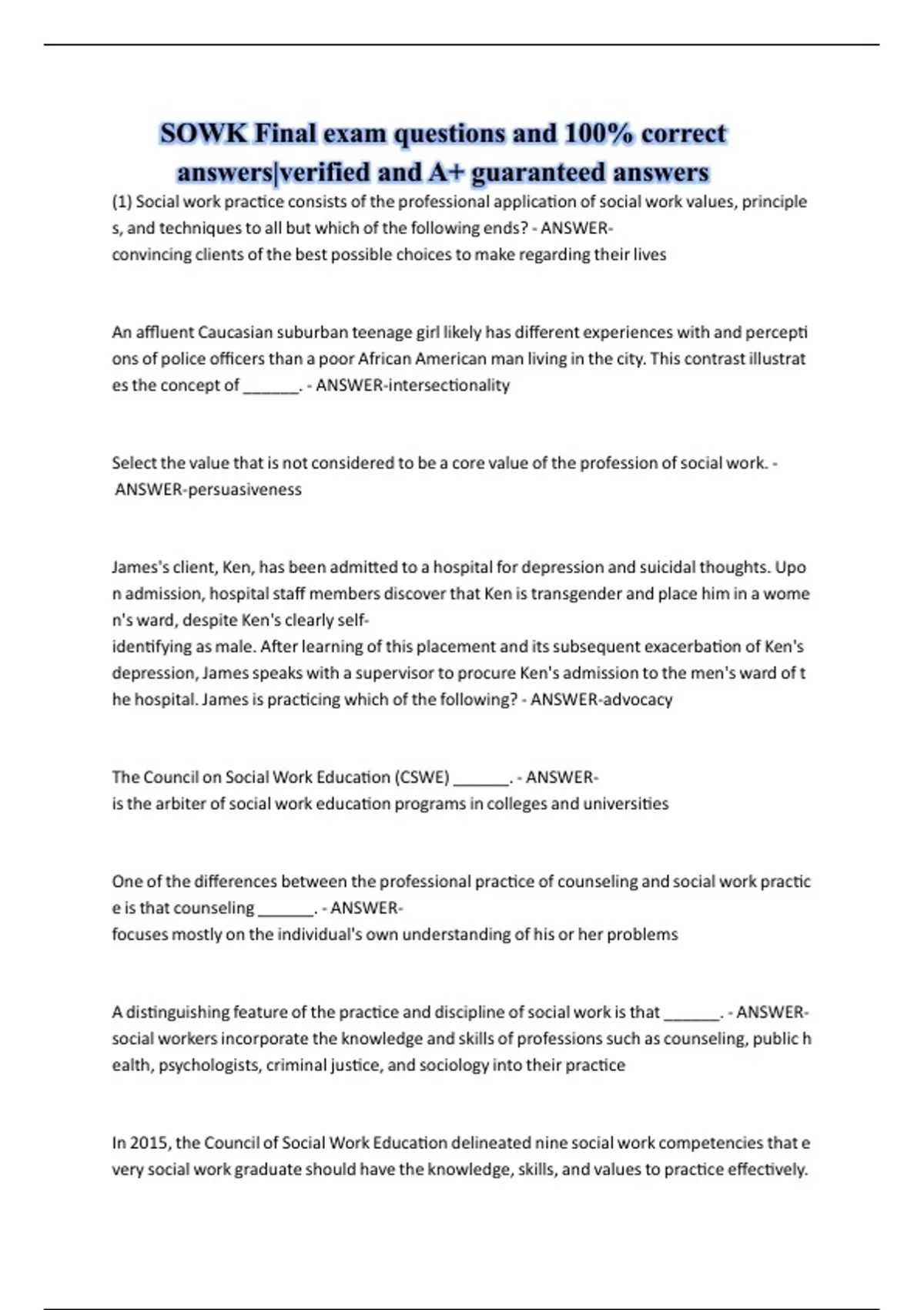 SOWK Final exam questions and 100% correct