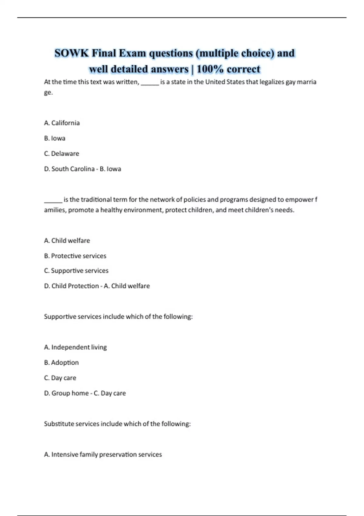 SOWK Final Exam questions (multiple choice) and