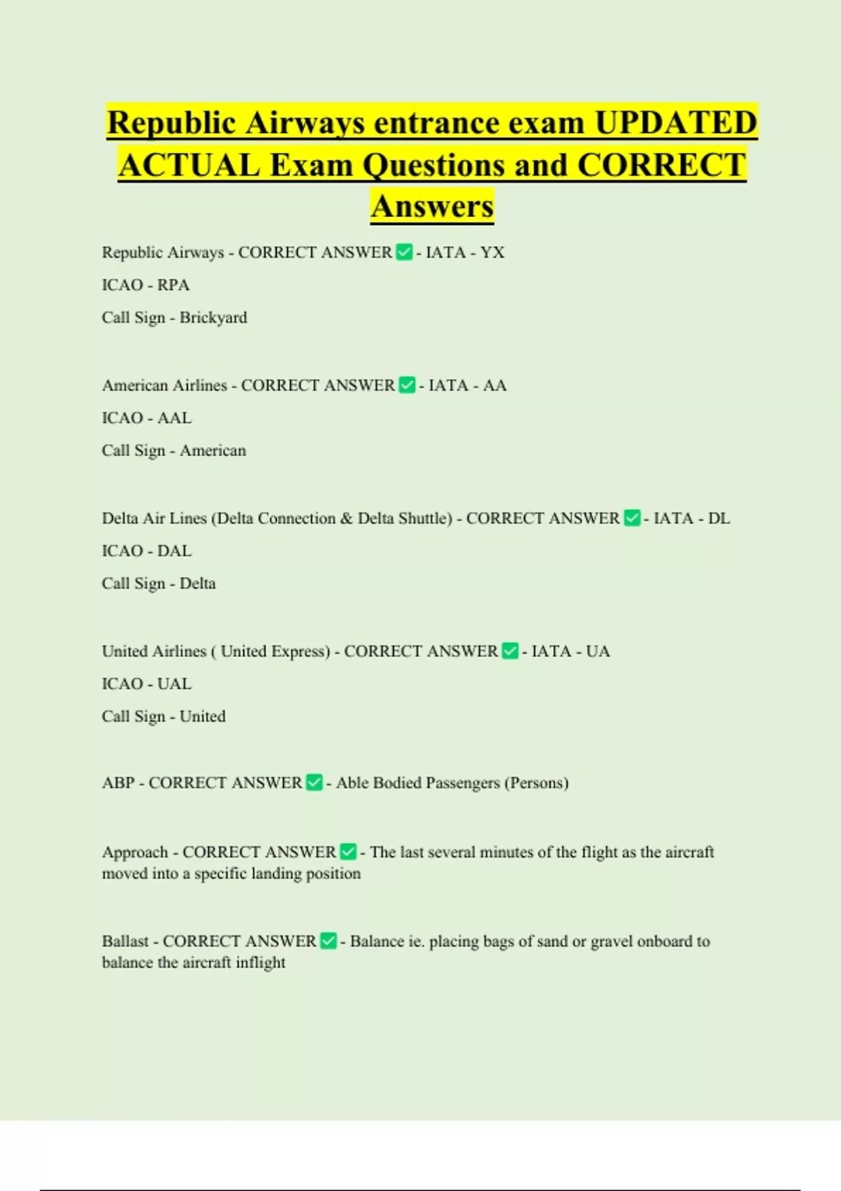 Republic Airways entrance exam UPDATED ACTUAL Exam Questions and CORRECT Answers Republic Airways - CORRECT ANSWER - IATA - YX ICAO - RPA Call Sign - Brickyard American Airlines - CORRECT ANSWER - IATA - AA