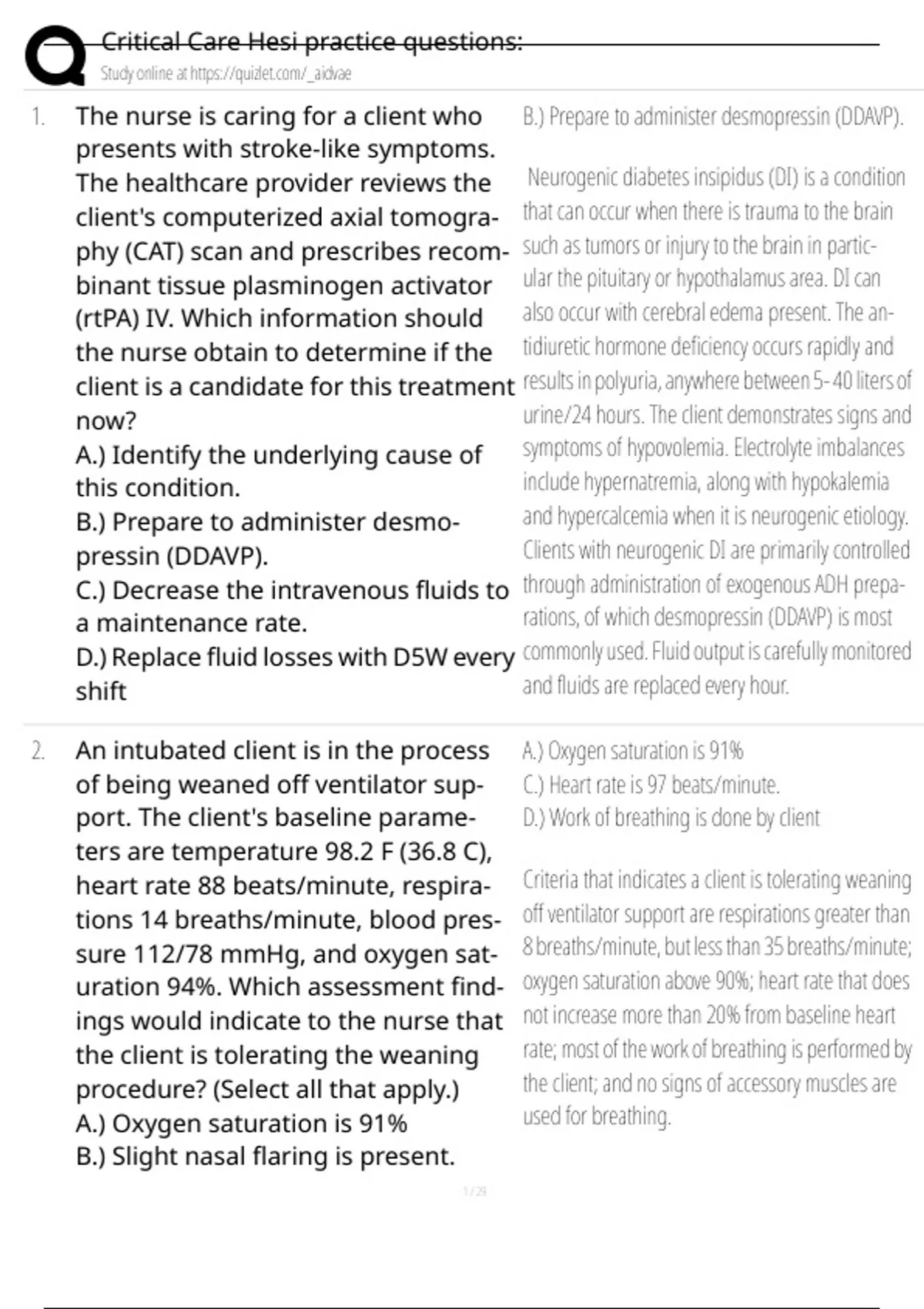 Critical Care Hesi practice questions:
