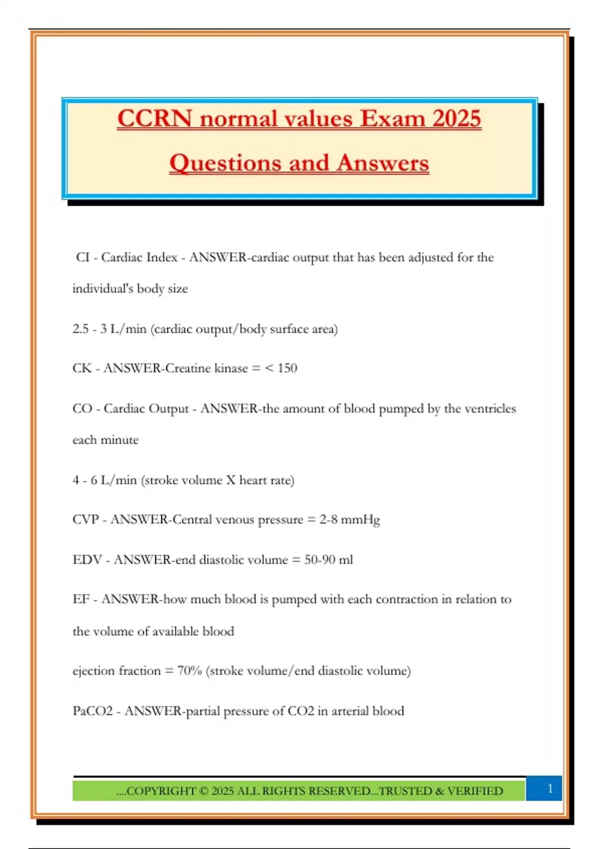 CCRN normal values Exam 2025