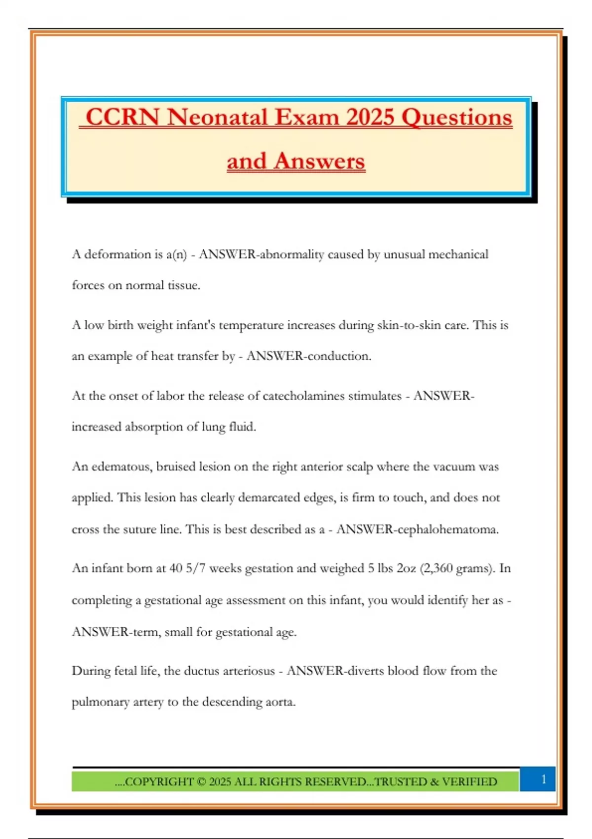 CCRN Neonatal Exam 2025 Questions