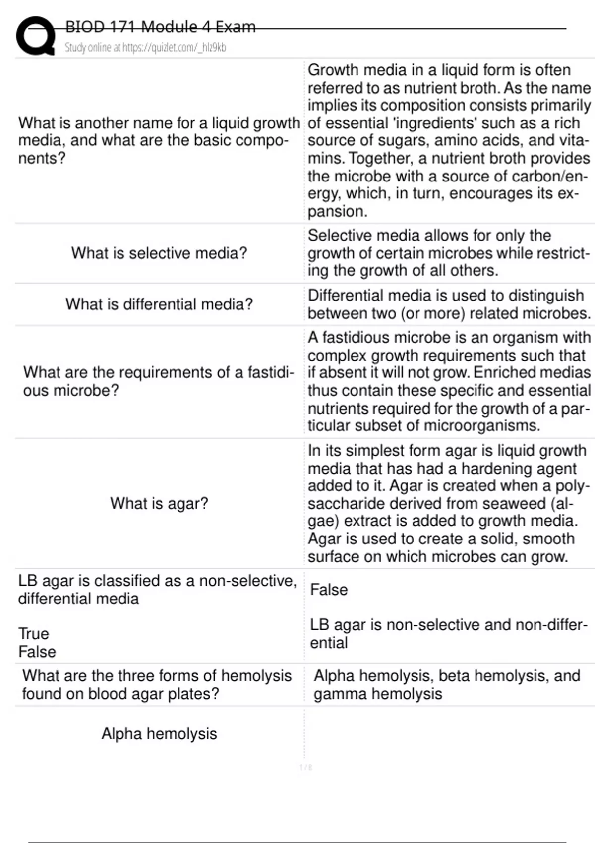 BIOD 171 Module 4 Exam Study online at What is another name for a liquid growth media, and what are the basic components? Growth media in a liquid form is often referred to as nutrient broth. As the name implies its composition consists primarily of essential 'ingredients' such as a rich source of sugars, amino acids, and vitamins. Together, a nutrient broth provides the microbe with a source of carbon/energy, which, in turn, encourages its expansion. What is selective media? Selective media allows for only the growth of certain microbes while restricting the growth of all others. What is differential media? Differential media is used to distinguish between two (