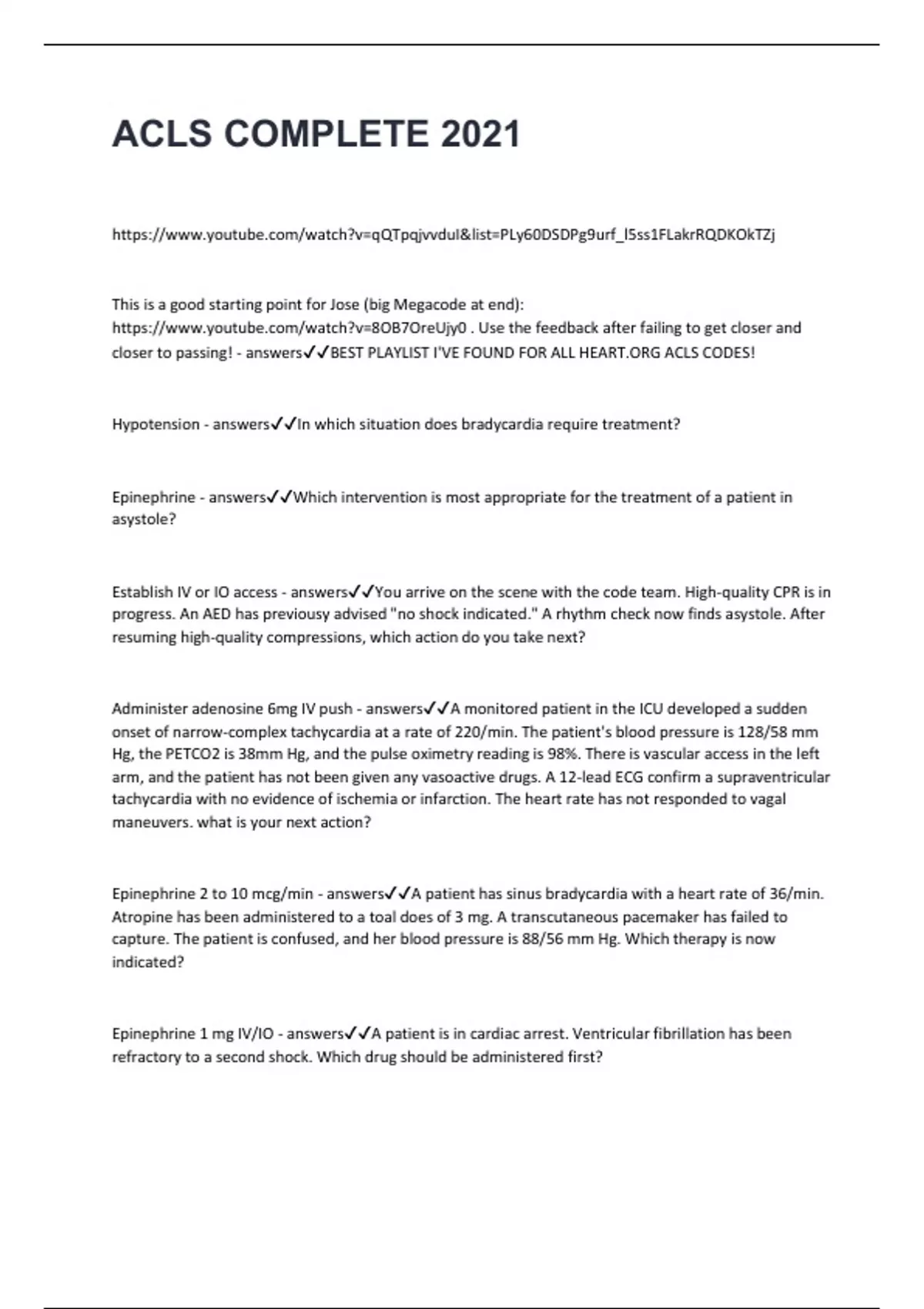 ACLS COMPLETE 2021 This is a good starting point for Jose (big Megacode at end): closer to passing! - answersBEST PLAYLIST I'VE FOUND FOR ALL HEART.ORG ACLS CODES! Hypotension - answersIn which situation does bradycardia require treatment? Epinephrine - answersWhich intervention is most appropriate for the treatment of a patient in asystole? Establish IV or IO access - answersYou arrive on the scene with the code team. High-quality CPR is in progress. An AED has previousy advised "no shock indicated." A rhythm check now finds asystole. After resuming high-quality compressions, which action do you take next? Administer adenosine 6mg IV push - answersA monitored patient in the ICU developed a sudden onset of narrow-complex tachycardia at a rate of 220/min. The patient's blood pressure is 128/58 mm Hg, the PETCO2 is 38mm Hg, and the pulse oximetry reading is 98%. There is vascular access in the left arm, and the patient has not been given any vasoactive drugs. A 12-lead ECG confirm a supraventricular tachycardia with no evidence of ischemia or infarction. The heart rate has not responded to vagal maneuvers. what is your next action? Epinephrine 2 to 10 mcg/min - answersA patient has sinus bradycardia with a heart rate of 36/min. Atropine has been administered to a toal does of 3 mg. A transcutaneous pacemaker has failed to capture. The patient is confused, and her blood pressure is 88/56 mm Hg. Which therapy is now indicated? Epinephrine 1 mg IV/IO - answersA patient is in cardiac arrest. Ventricular fibrillation has been refractory to a second shock. Which drug should be administered first?