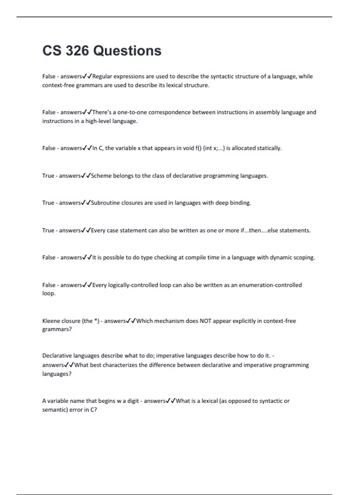 CS 326 Questions False - answersRegular expressions are used to describe the syntactic structure of a language, while context-free grammars are used to describe its lexical structure. False - answersThere's a one-to-one correspondence between instructions in assembly language and instructions in a high-level language. False - answersIn C, the variable x that appears in void f() {int x;...} is allocated statically. True - answersScheme belongs to the class of declarative programming languages. True - answersSubroutine closures are used in languages with deep binding. True - answersEvery case statement can also be written as one or more if...then....else statements. False - answersIt is possible to do type checking at compile time in a language with dynamic scoping. False - answersEvery logically-controlled loop can also be written as an enumeration-controlled loop. Kleene closure (the *) - answersWhich mechanism does NOT appear explicitly in context-free grammars? Declarative languages describe what to do; imperative languages describe how to do it. - answersWhat best characterizes the difference between declarative and imperative programming languages? A variable name that begins w a digit - answersWhat is a lexical (as opposed to syntactic or semantic) error in C
