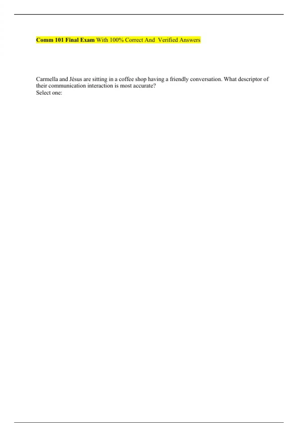 Comm 101 Final Exam With 100% Correct And Verified Answers Carmella and Jésus are sitting in a coffee shop having a friendly conversation. What descriptor of their communication interaction is most accurate? Select one: a. group communication b. intrapersonal communication c. dyadic communication d. linguistic communication Communication begins with the Select one: a. self. b. other. c. dyad. d. group.