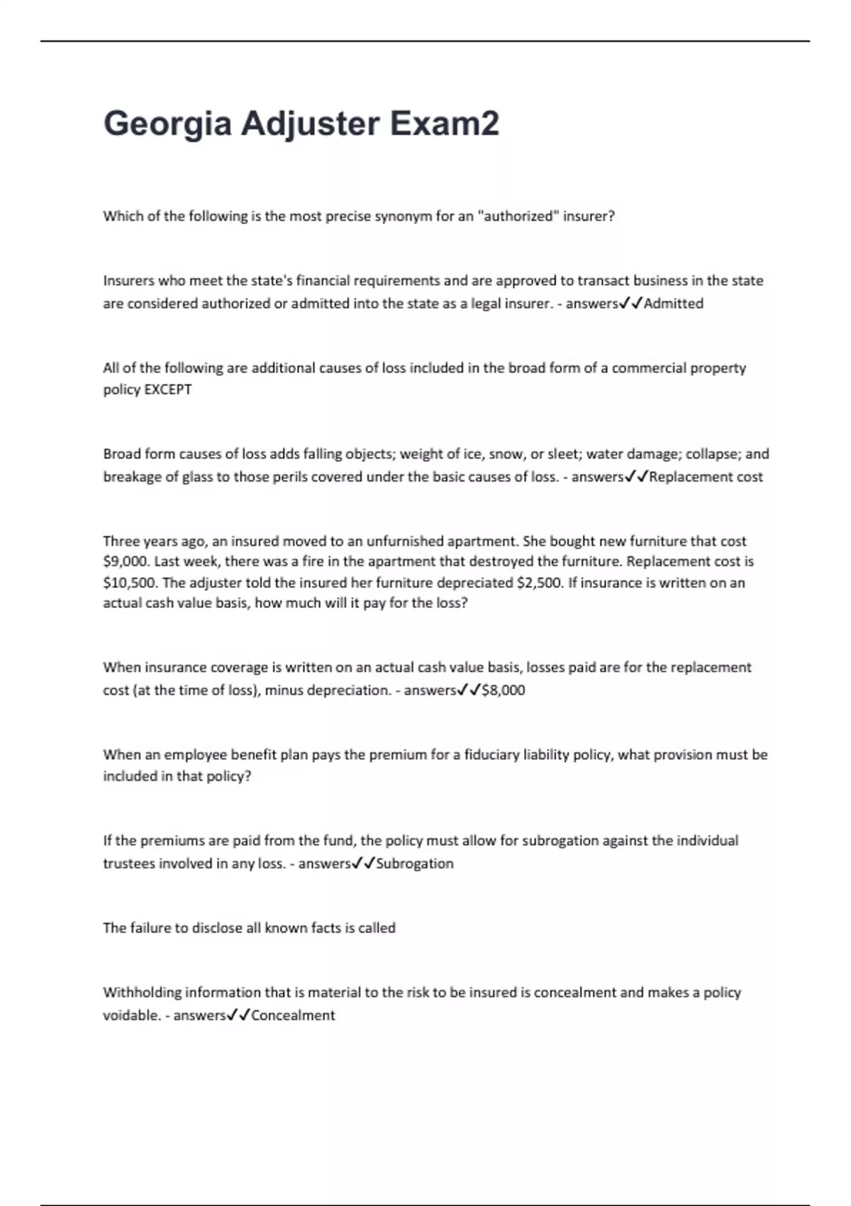 Georgia Adjuster Exam2 Which of the following is the most precise synonym for an "authorized" insurer? Insurers who meet the state's financial requirements and are approved to transact business in the state are considered authorized or admitted into the state as a legal insurer. - answersAdmitted All of the following are additional causes of loss included in the broad form of a commercial property policy EXCEPT Broad form causes of loss adds falling objects; weight of ice, snow, or sleet; water damage; collapse; and breakage of glass to those perils covered under the basic causes of loss. - answersReplacement cost Three years ago, an insured moved to an unfurnished apartment. She bought new furniture that cost $9,000. Last week, there was a fire in the apartment that destroyed the furniture. Replacement cost is $10,500. The adjuster told the insured her furniture depreciated $2,500. If insurance is written on an actual cash value basis, how much will it pay for the loss? When insurance coverage is written on an actual cash value basis, losses paid are for the replacement cost (at the time of loss), minus depreciation. - answers$8,000 When an employee benefit plan pays the premium for a fiduciary liability policy, what provision must be included in that policy? If the premiums are paid from the fund, the policy must allow for subrogation against the individual trustees involved in any loss. - answersSubrogation The failure to disclose all known facts is called Withholding information that is material to the risk to be insured is concealment and makes a policy voidable. - answersConcealmen