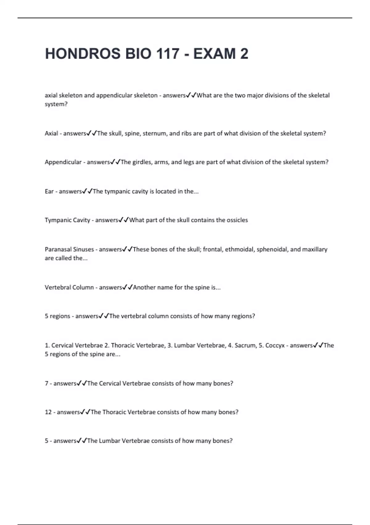 HONDROS BIO 117 - EXAM 2 axial skeleton and appendicular skeleton - answersWhat are the two major divisions of the skeletal system? Axial - answersThe skull, spine, sternum, and ribs are part of what division of the skeletal system? Appendicular - answersThe girdles, arms, and legs are part of what division of the skeletal system? Ear - answersThe tympanic cavity is located in the... Tympanic Cavity - answersWhat part of the skull contains the ossicles Paranasal Sinuses - answersThese bones of the skull; frontal, ethmoidal, sphenoidal, and maxillary are called the... Vertebral Column - answersAnother name for the spine is... 5 regions - answersThe vertebral column consists of how many regions? 1. Cervical Vertebrae 2. Thoracic Vertebrae, 3. Lumbar Vertebrae, 4. Sacrum, 5. Coccyx - answersThe 5 regions of the spine are... 7 - answersThe Cervical Vertebrae consists of how many bones? 12 - answersThe Thoracic Vertebrae consists of how many bones? 5 - answersThe Lumbar Vertebrae consists of how many bones?
