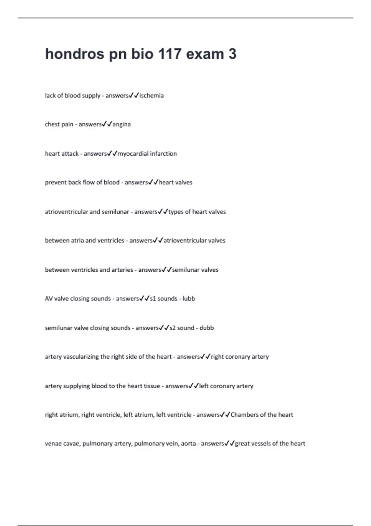 hondros pn bio 117 exam 3 lack of blood supply - answersischemia chest pain - answersangina heart attack - answersmyocardial infarction prevent back flow of blood - answersheart valves atrioventricular and semilunar - answerstypes of heart valves between atria and ventricles - answersatrioventricular valves between ventricles and arteries - answerssemilunar valves AV valve closing sounds - answerss1 sounds - lubb semilunar valve closing sounds - answerss2 sound - dubb artery vascularizing the right side of the heart - answersright coronary artery artery supplying blood to the heart tissue - answersleft coronary artery right atrium, right ventricle, left atrium, left ventricle - answersChambers of the heart venae cavae, pulmonary artery, pulmonary vein, aorta - answersgreat vessels of the heart