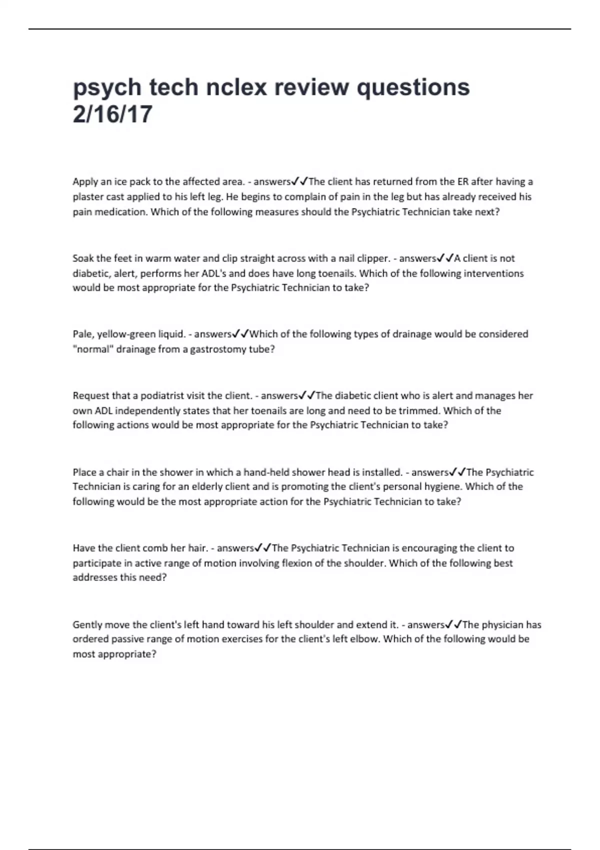 Have the client comb her hair. - answers✔✔The Psychiatric Technician is encouraging the client to