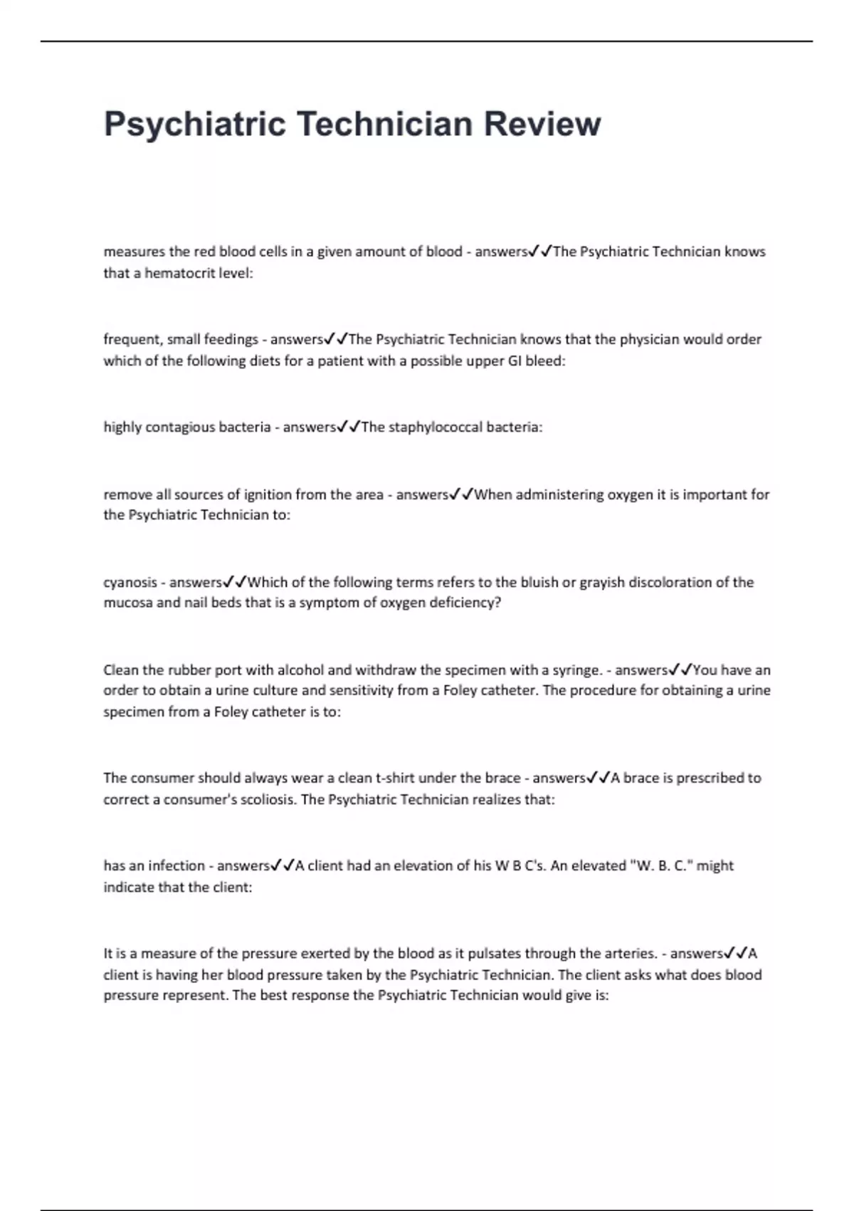 Psychiatric Technician Review measures the red blood cells in a given amount of blood - answersThe Psychiatric Technician knows that a hematocrit level: frequent, small feedings - answersThe Psychiatric Technician knows that the physician would order which of the following diets for a patient with a possible upper GI bleed: highly contagious bacteria - answersThe staphylococcal bacteria: remove all sources of ignition from the area - answersWhen administering oxygen it is important for the Psychiatric Technician to: cyanosis - answersWhich of the following terms refers to the bluish or grayish discoloration of the mucosa and nail beds that is a symptom of oxygen deficiency? Clean the rubber port with alcohol and withdraw the specimen with a syringe. - answersYou have an order to obtain a urine culture and sensitivity from a Foley catheter. The procedure for obtaining a urine specimen from a Foley catheter is to: The consumer should always wear a clean t-shirt under the brace - answersA brace is prescribed to correct a consumer's scoliosis. The Psychiatric Technician realizes that: has an infection - answersA client had an elevation of his W B C's. An elevated "W. B. C." might indicate that the client: It is a measure of the pressure exerted by the blood as it pulsates through the arteries. - answersA client is having her blood pressure taken by the Psychiatric Technician. The client asks what does blood pressure represent. The best response the Psychiatric Technician would give is: