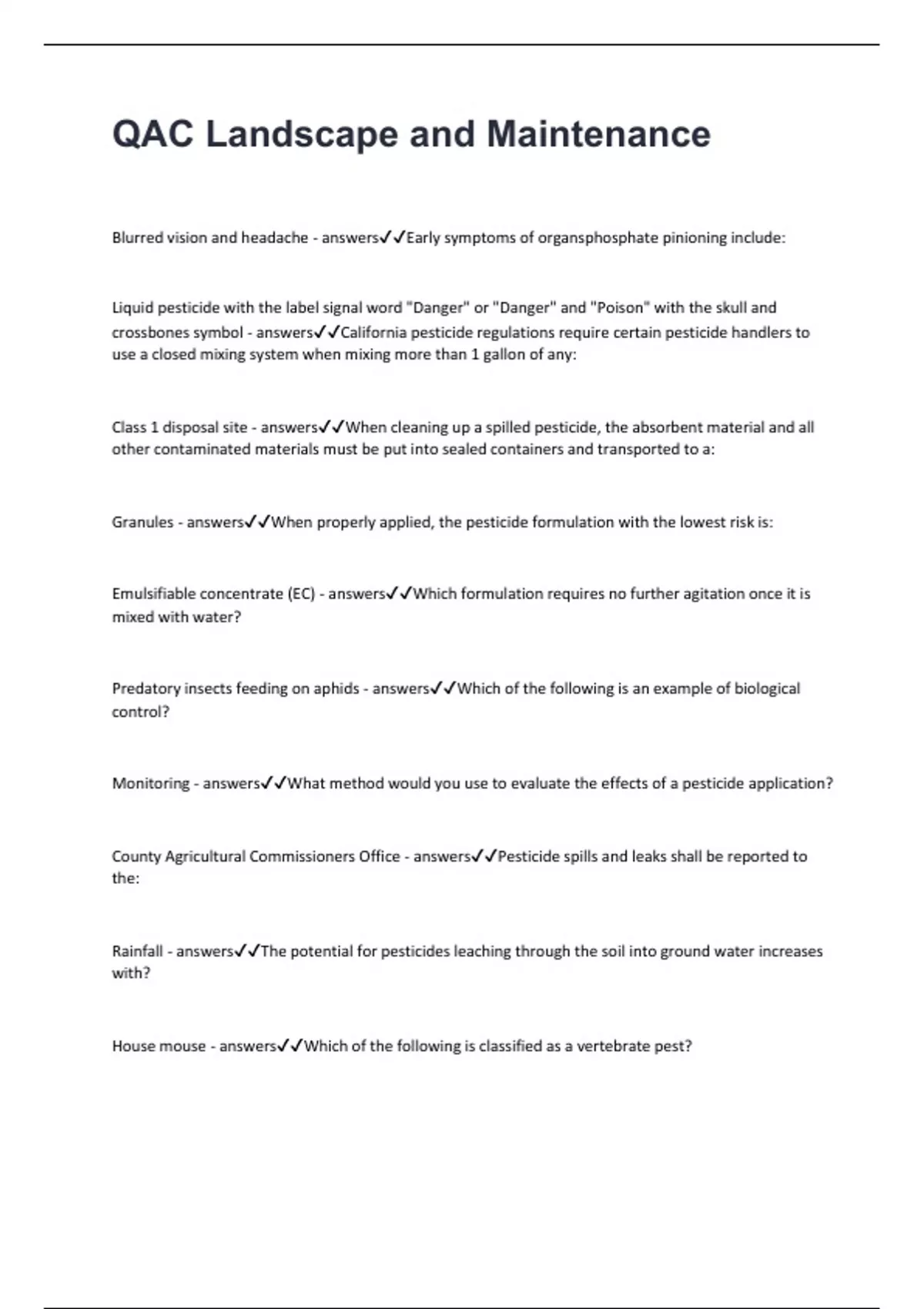 QAC Landscape and Maintenance Blurred vision and headache - answersEarly symptoms of organsphosphate pinioning include: Liquid pesticide with the label signal word "Danger" or "Danger" and "Poison" with the skull and crossbones symbol - answersCalifornia pesticide regulations require certain pesticide handlers to use a closed mixing system when mixing more than 1 gallon of any: Class 1 disposal site - answersWhen cleaning up a spilled pesticide, the absorbent material and all other contaminated materials must be put into sealed containers and transported to a: Granules - answersWhen properly applied, the pesticide formulation with the lowest risk is: Emulsifiable concentrate (EC) - answersWhich formulation requires no further agitation once it is mixed with water? Predatory insects feeding on aphids - answersWhich of the following is an example of biological control? Monitoring - answersWhat method would you use to evaluate the effects of a pesticide application? County Agricultural Commissioners Office - answersPesticide spills and leaks shall be reported to the: Rainfall - answersThe potential for pesticides leaching through the soil into ground water increases with? House mouse - answersWhich of the following is classified as a vertebrate pest?