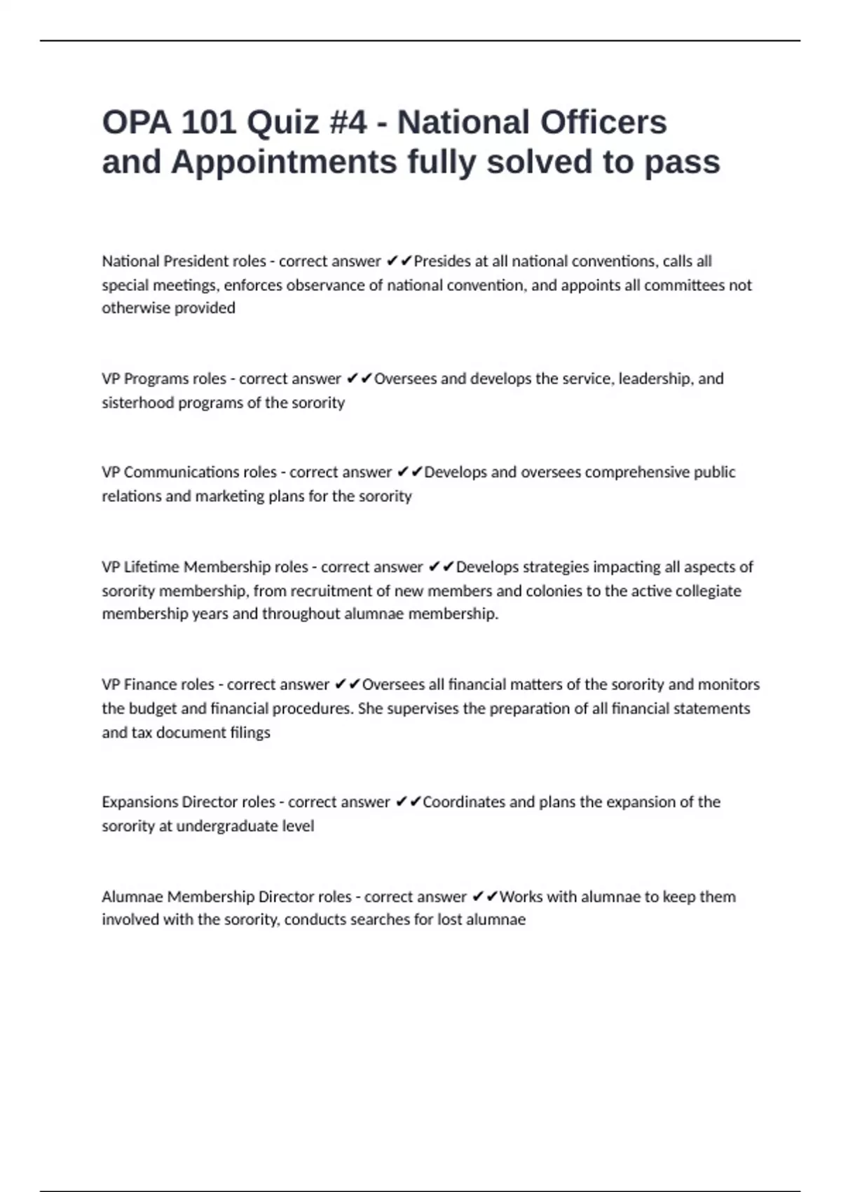 VP Finance roles - correct answer ✔✔Oversees all financial matters of the sorority and monitors
