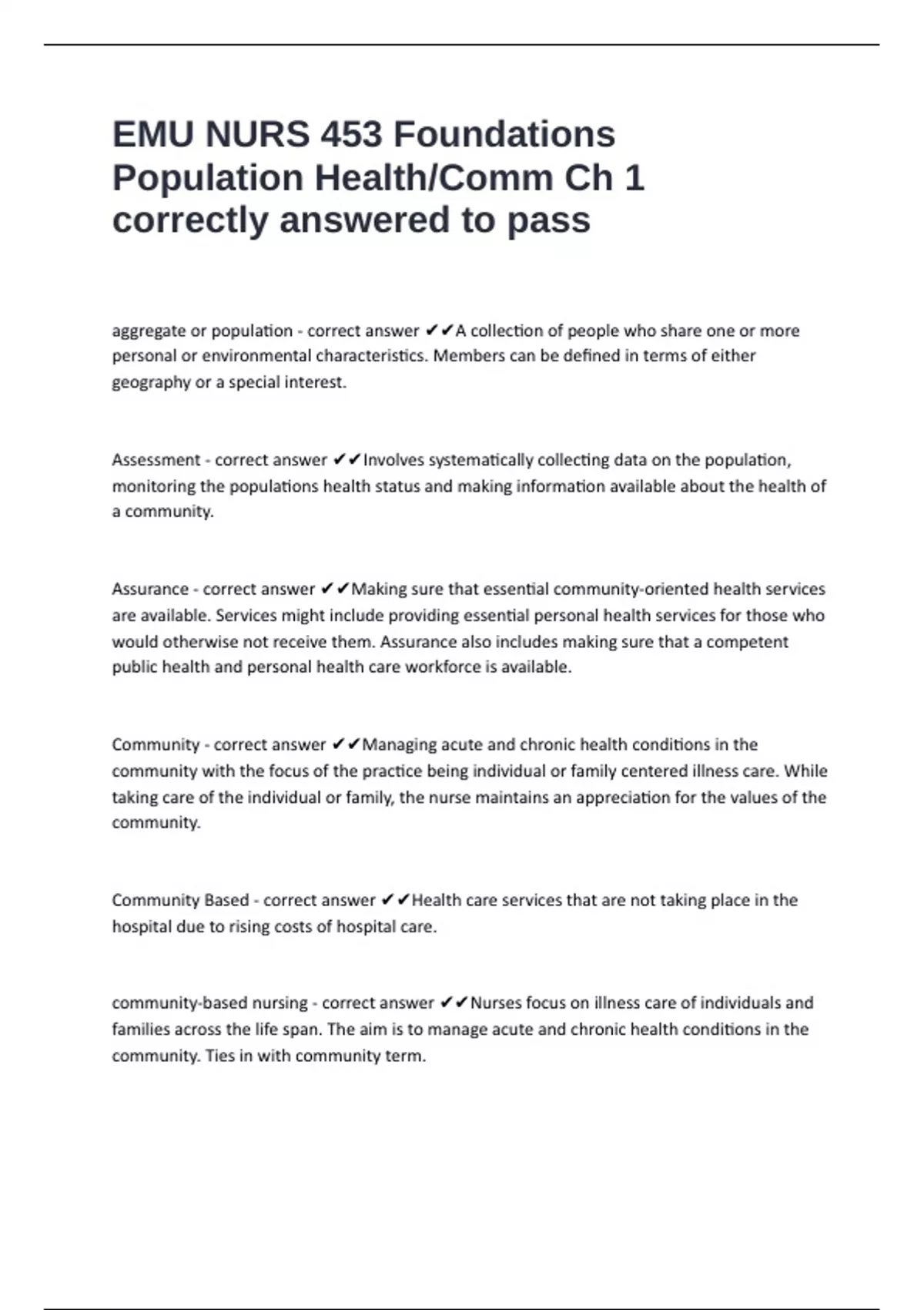 Assurance - correct answer ✔✔Making sure that essential community-oriented health services