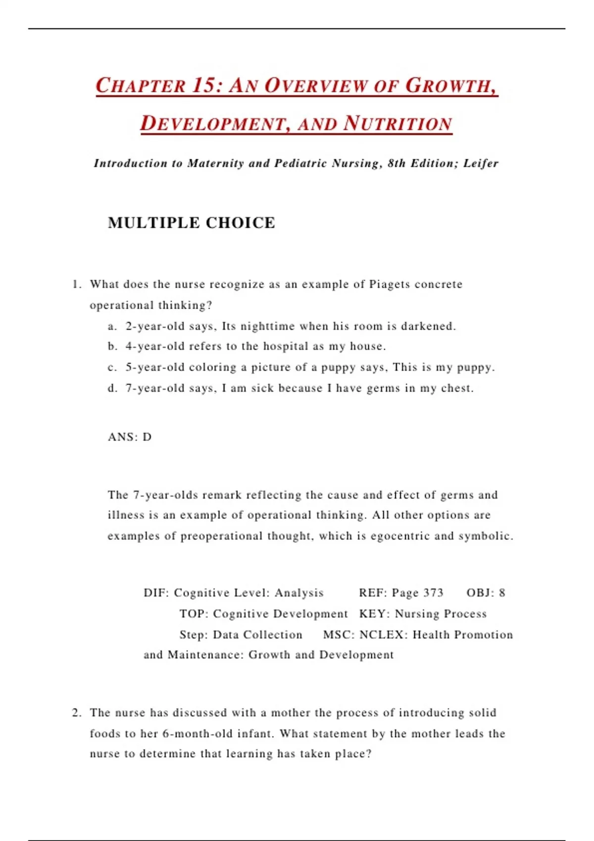 MULTIPLE CHOICE 1. What does the nurse recognize as an example of Piagets concrete operational thinking? a. 2-year-old says, Its nighttime when his room is darkened. b. 4-year-old refers to the hospital as my house. c. 5-year-old coloring a picture of a puppy says, This is my puppy. d. 7-year-old says, I am sick because I have germs in my chest. ANS: D The 7-year-olds remark reflecting the cause and effect of germs and illness is an example of operational thinking. All other options are examples of preoperational thought, which is egocentric and symbolic. DIF: Cognitive Level: Analysis REF: Page 373 OBJ: 8 TOP: Cognitive Development KEY: Nursing Process Step: Data Collection MSC: NCLEX: Health Promotion and Maintenance: Growth and Development 2. The nurse has discussed with a mother the process of introducing solid foods to her 6-month-old infant. What statement by the mother leads the nurse to determine that learning has taken place? a. I will give my infant rice cereal first. b. I will give my infant yellow vegetables first. c. I will give my infant egg yolks first. d. I will give my infant fruits first. ANS: A Solid foods are usually introduced at about 6 months of age, starting with rice cereal, which is the least allergenic. DIF: Cognitive Level: Comprehension REF: Page 379 OBJ: 9 TOP: Feeding the Healthy Child KEY: Nursing Process Step: Evaluation MSC: NCLEX: Health Promotion and Maintenance: Growth and Development 3. What is the best nursing action when an 8-year-old child comes to the school nurse with his central incisor in his hand and reports he knocked his tooth out on the water fountain? a. Give him an ice cube to suck on. b. Have him wash his mouth out with peroxide and water. c. Wrap the tooth in a clean tissue. d. Wash off the tooth and place it in a container of milk.