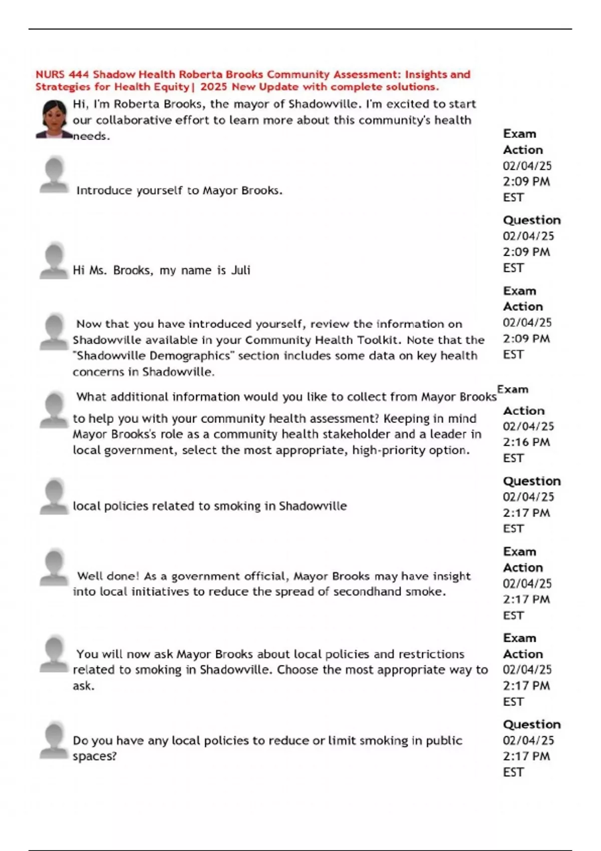 NURS 444 Shadow Health Roberta Brooks Community Assessment: Insights and Strategies for Health Equity| 2025 New Update with complete solutions.