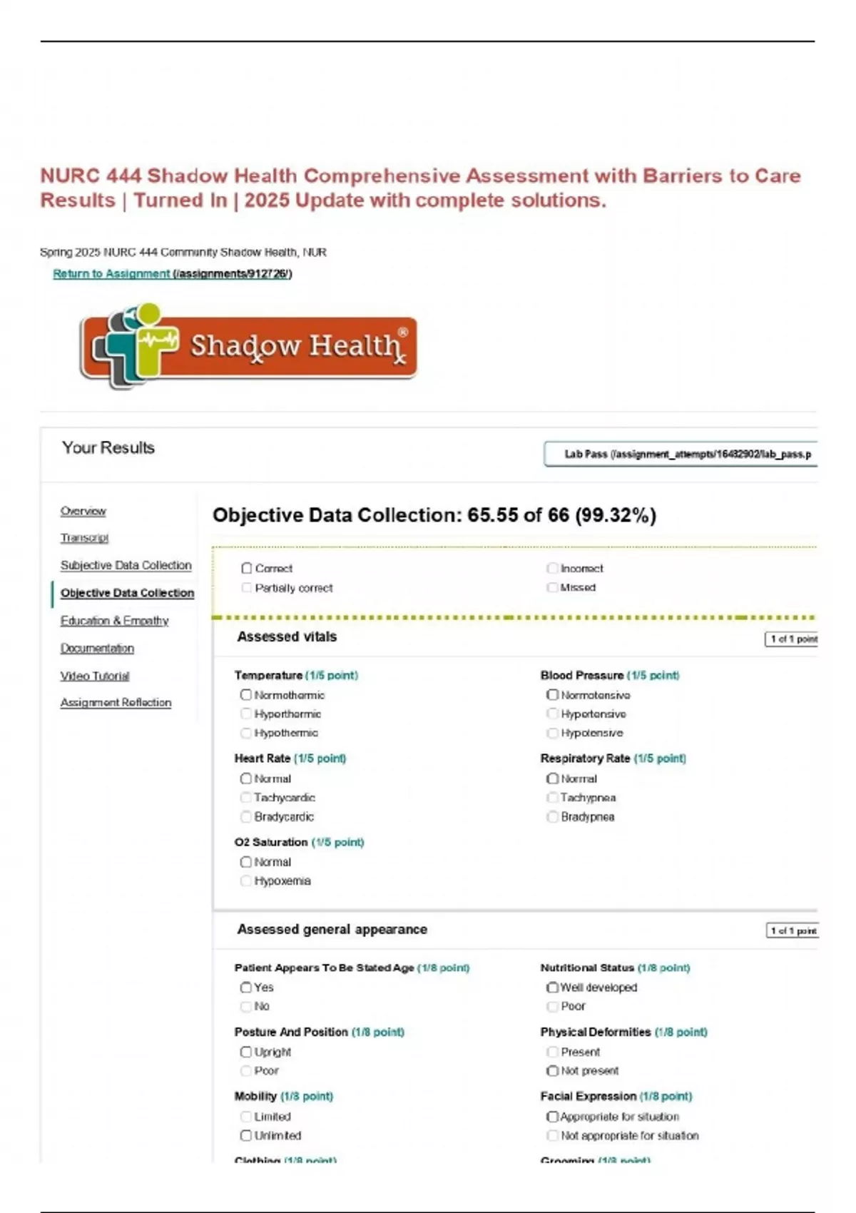 NURC 444 Shadow Health Comprehensive Assessment with Barriers to Care Results | Turned In | 2025 Update with complete solutions.