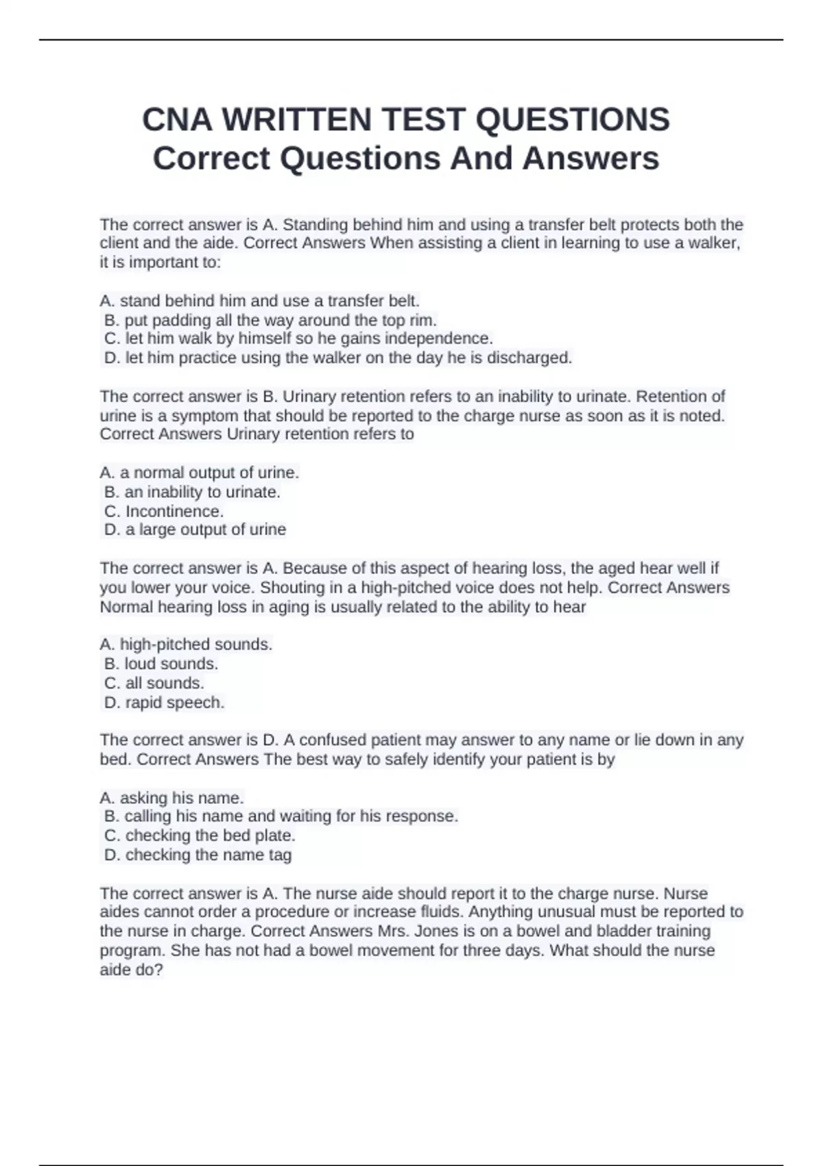 CNA WRITTEN TEST QUESTIONS Correct Questions And Answers