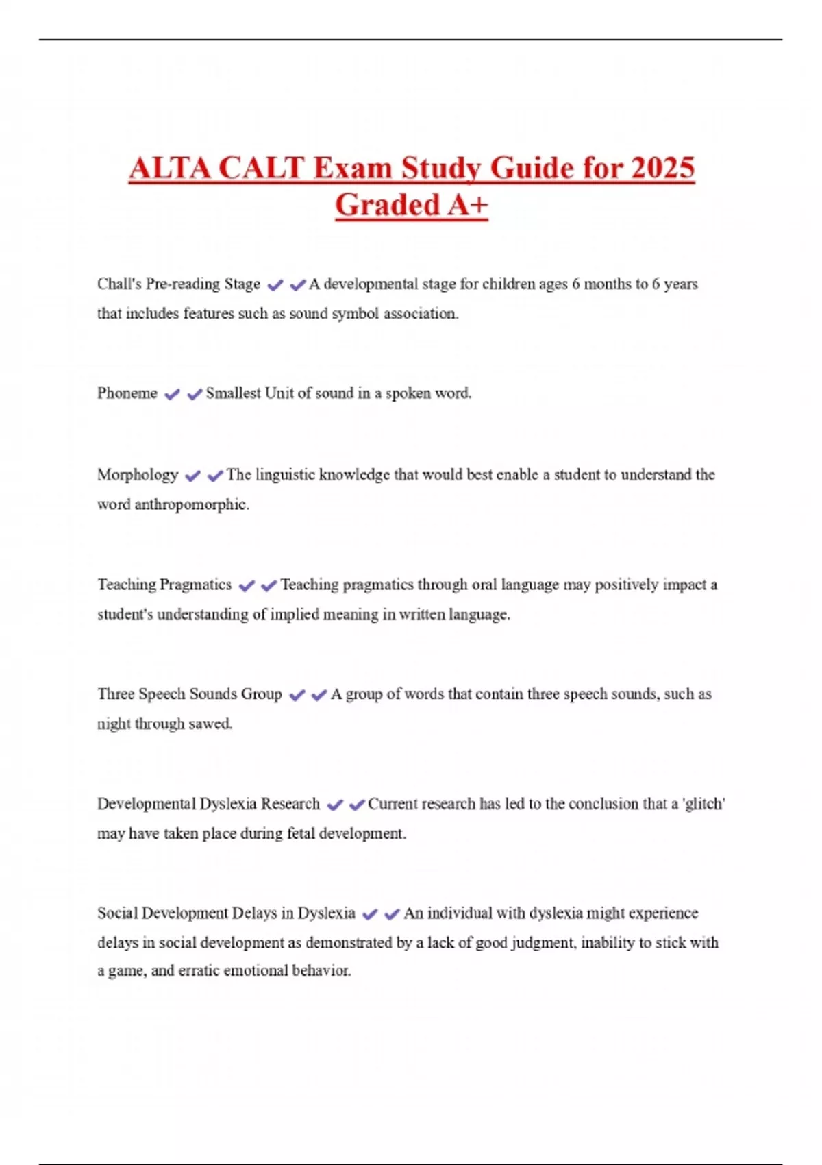 ALTA CALT Exam Study Guide for 2025 Graded A+ Chall's Pre-reading Stage A developmental stage for children ages 6 months to 6 years that includes features such as sound symbol association. Phoneme Morphology Smallest Unit of sound in a spoken word. The linguistic knowledge that would best enable a student to understand the word anthropomorphic. Teaching Pragmatics Teaching pragmatics through oral language may positively impact a student's understanding of implied meaning in written language.