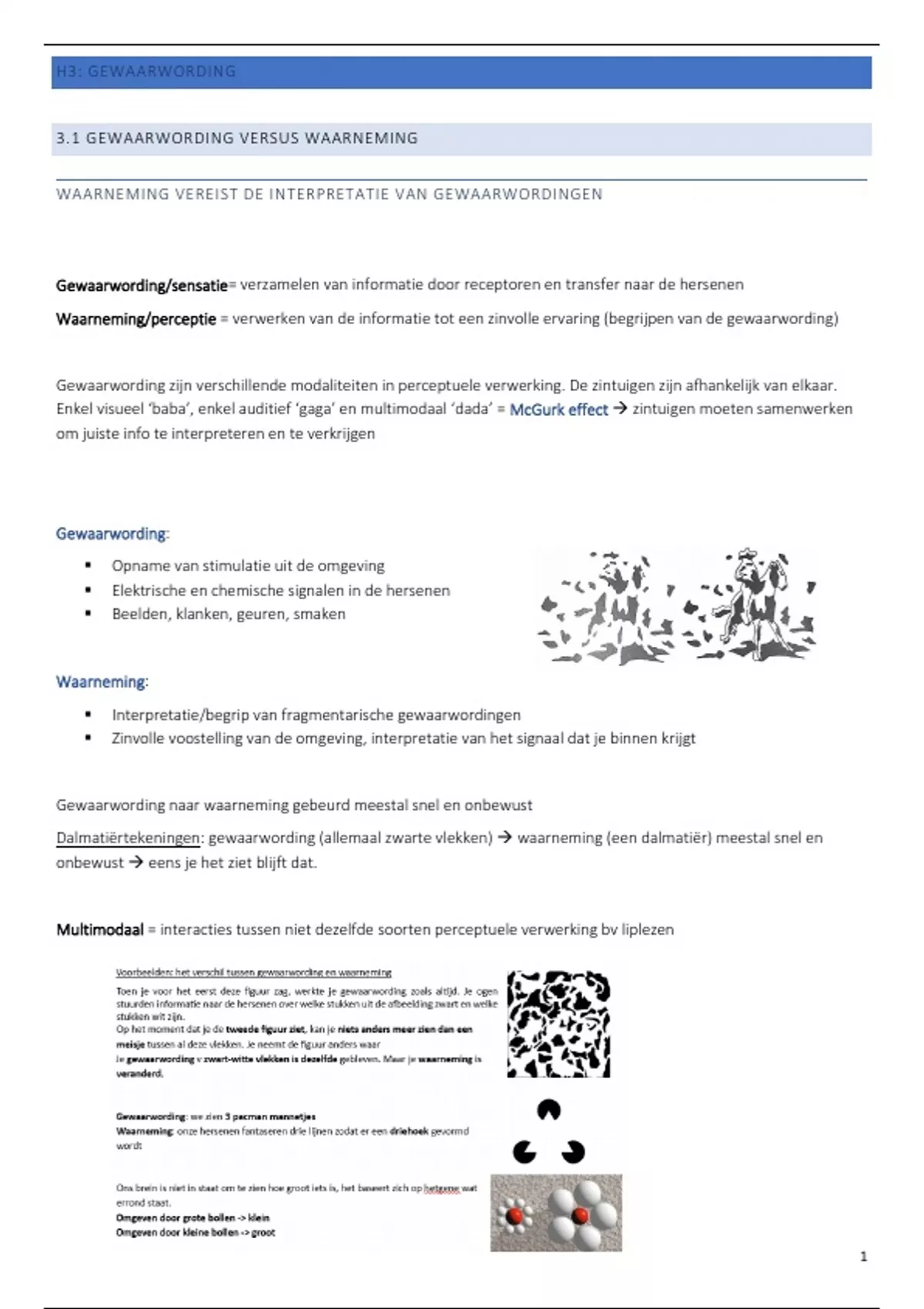 Dalmatiërtekeningen: gewaarwording (allemaal zwarte vlekken) → waarneming (een dalmatiër) meestal snel en