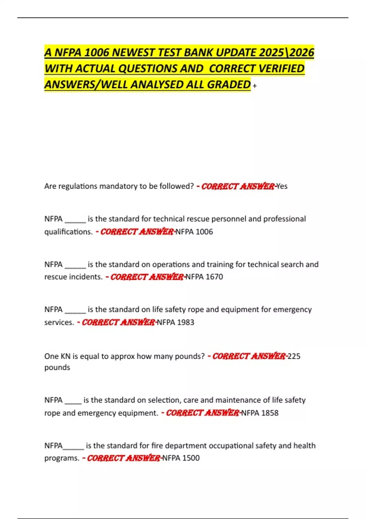 A NFPA 1006 NEWEST TEST BANK UPDATE WITH ACTUAL QUESTIONS AND CORRECT VERIFIED ANSWERS/WELL ANALYSED ALL GRADED
