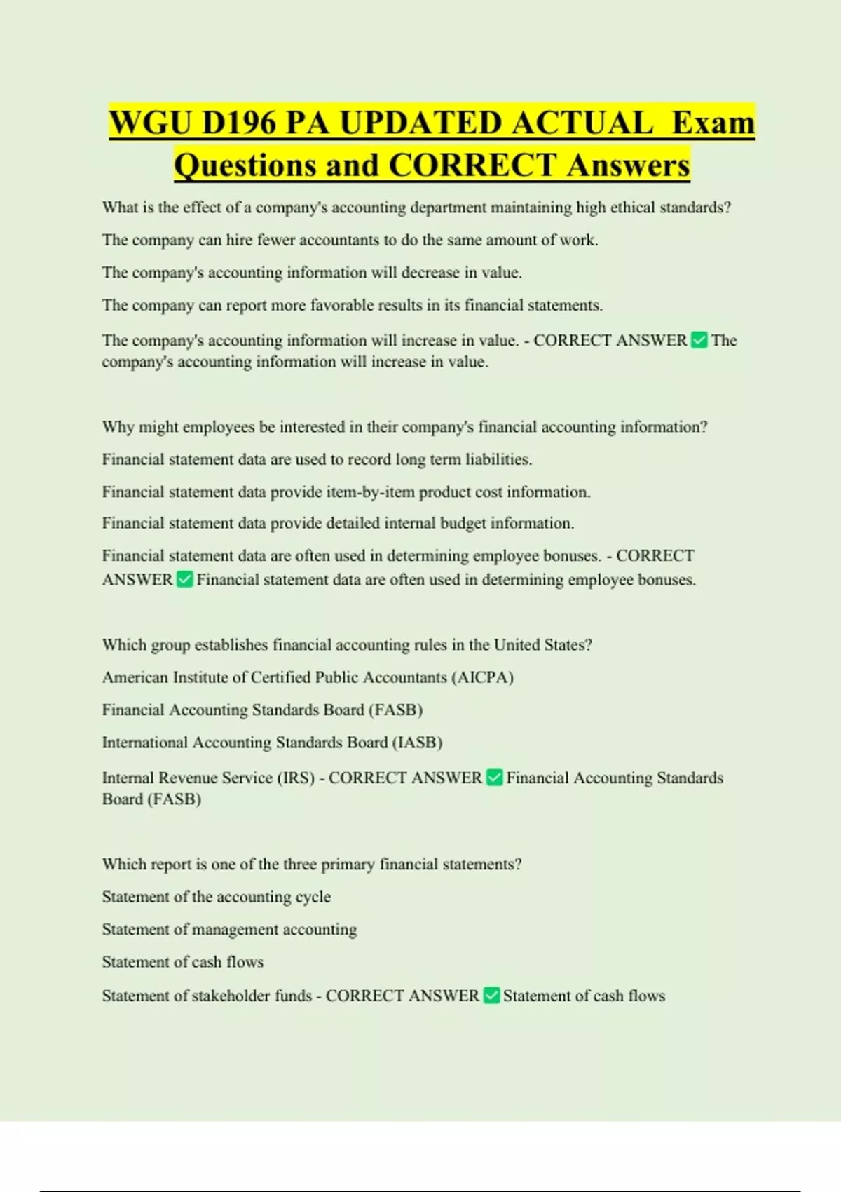 WGU D196 PA UPDATED ACTUAL Exam Questions and CORRECT Answers What is the effect of a company's accounting department maintaining high ethical standards? The company can hire fewer accountants to do the same amount of work. The company's accounting information will decrease in value. The company can report more favorable results in its financial statements. The company's accounting information will increase in value. - CORRECT ANSWER company's accounting information will increase in value. Why might employees be interested in their company's financial accounting information? Financial statement data are used to record long term liabilities. Financial statement data provide item-by-item product cost information. Financial statement data provide detailed internal budget information. Financial statement data are often used in determining employee bonuses