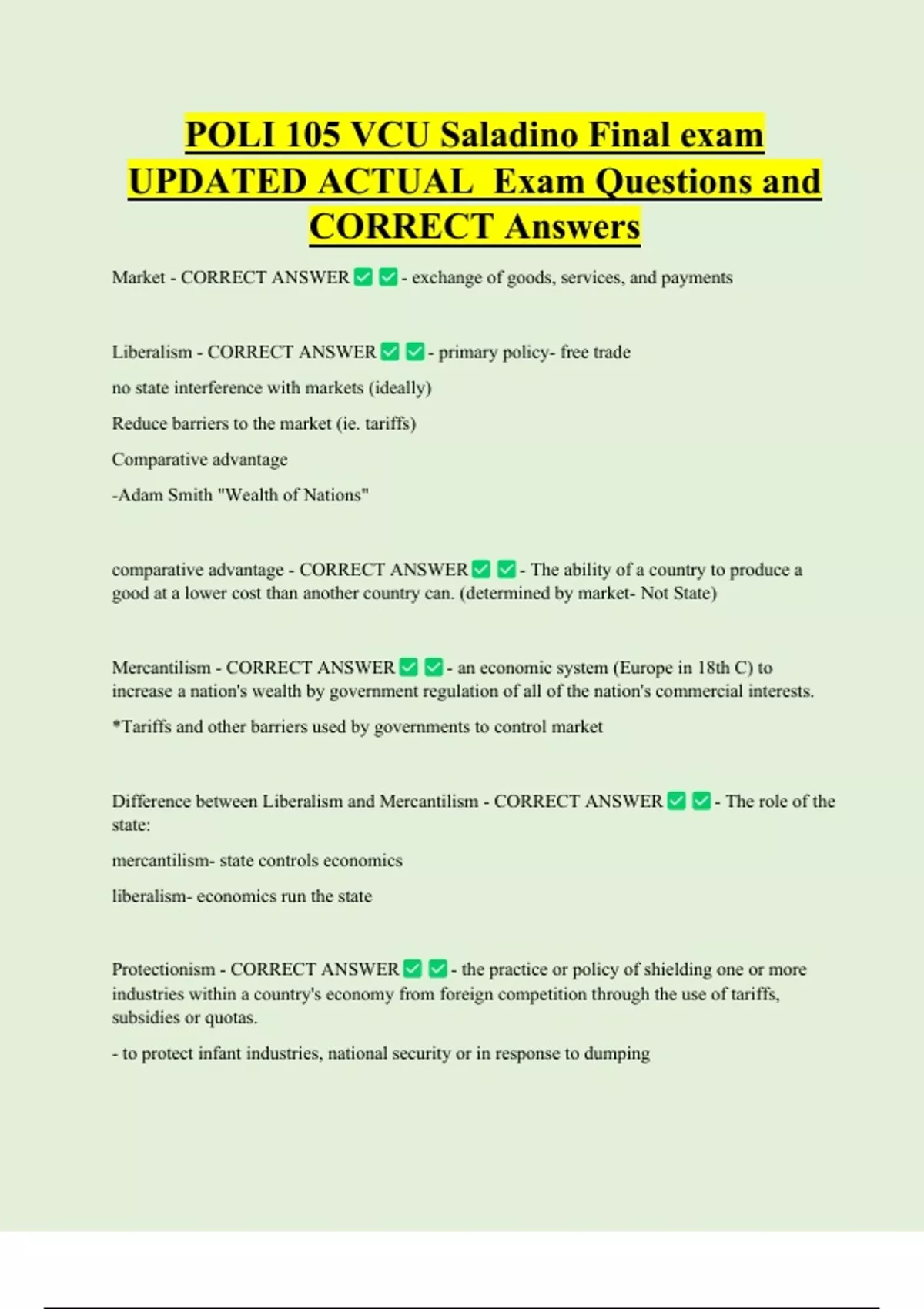 POLI 105 VCU Saladino Final exam UPDATED ACTUAL Exam Questions and CORRECT Answers Market - CORRECT ANSWER Liberalism - CORRECT ANSWER - exchange of goods, services, and payments - primary policy- free trade no state interference with markets (ideally) Reduce barriers to the market (ie. tariffs) Comparative advantage -Adam Smith "Wealth of N