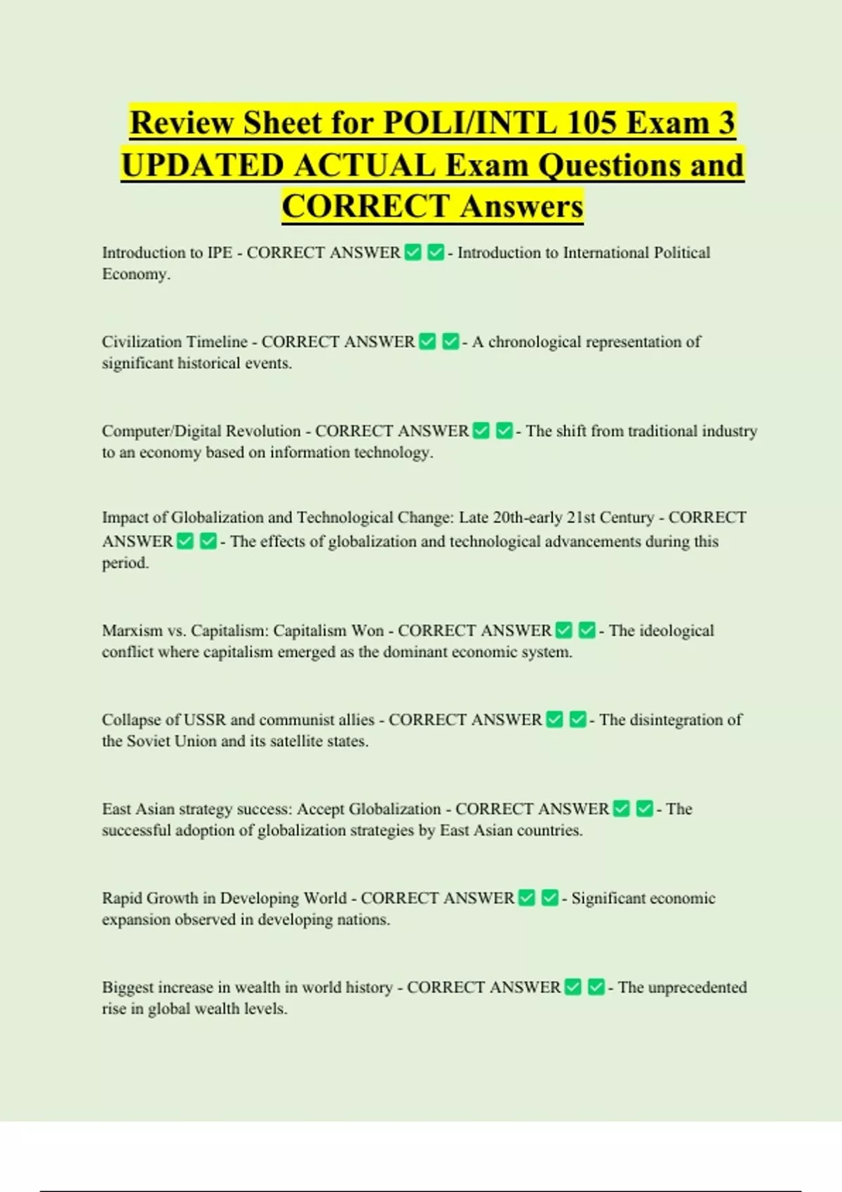 Review Sheet for POLI/INTL 105 Exam 3 UPDATED ACTUAL Exam Questions and CORRECT Answers Introduction to IPE - CORRECT ANSWER Economy. Civilization Timeline - CORRECT ANSWER significant historical events. - Introduction to International Political - A chronological representation of Computer/Digital Revolution - CORRECT ANSWER to an economy based on information technology. - The shift from traditional industry