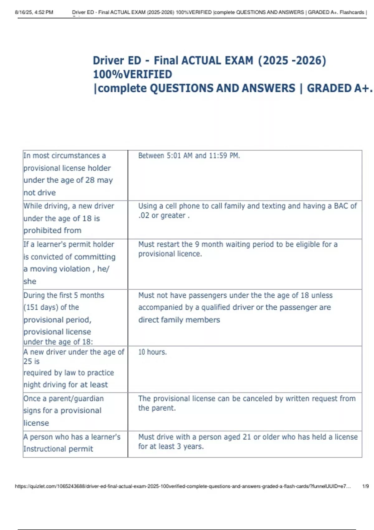 , 8/16/25, 4:52 PM Driver ED - Final ACTUAL EXAM (2025-2026) 100%VERIFIED |complete QUESTIONS AND ANSWERS | GRADED A+. Flashcards |