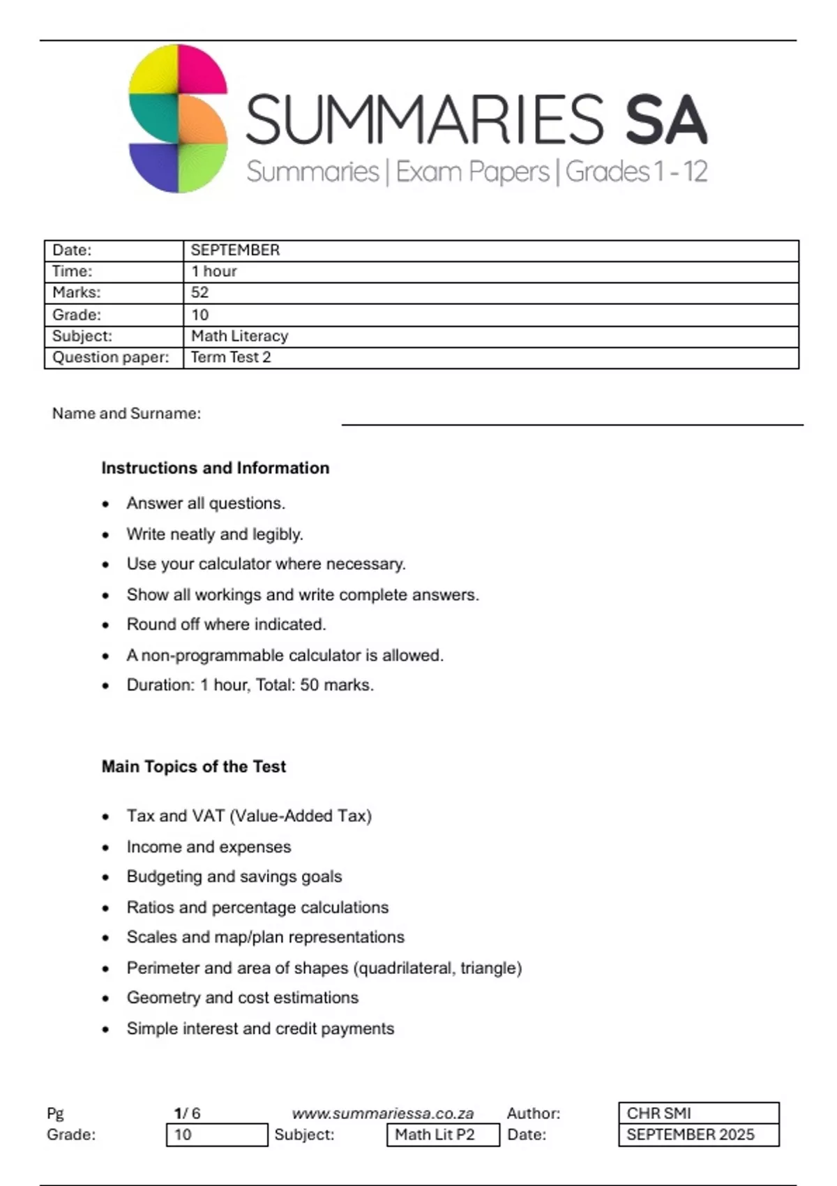 Grade: 10 Subject: Math Lit P2 Date: SEPTEMBER 2025
