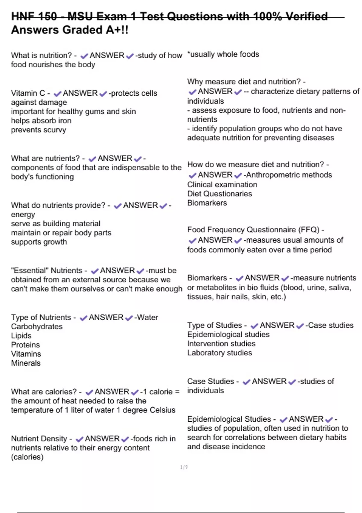 , HNF 150 - MSU Exam 1 Test Questions with 100% Verified