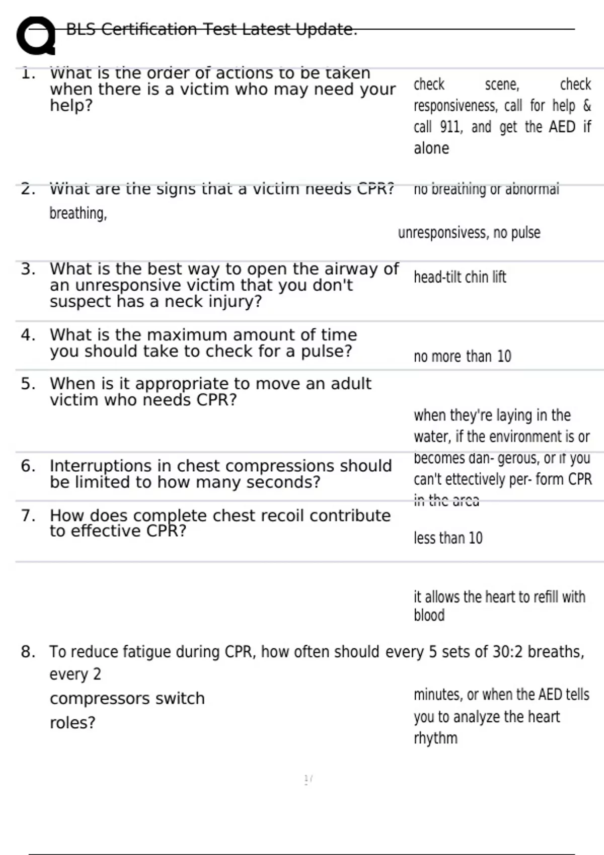 BLS Certification Test Latest Update. 1. What is the order of actions to be taken when there is a victim who may need your help? check scene, check responsiveness, call for help & call 911, and get the AED if alone 2. What are the signs that a victim needs CPR? no breathing or abnormal breathing, unresponsivess, no pulse 3. What is the best way to open the airway of an unresponsive victim that you don't suspect has a neck injury? 4. What is the maximum amount of time you should take to check for a pulse? 5. When is it appropriate to move an adult victim who needs CPR? 6. Interruptions in chest compressions should be limited to how many seconds? 7. How does complete chest recoil contribute to effective CPR? head-tilt chin lift no more than 10 when they're laying in the water, if the environment is or becomes dan- gerous, or if you can't ettectively per- form CPR in the area less than 10 it allows the heart to refill with blood 8. To reduce fatigue during CPR, how often should every 5 sets of 30:2 breaths, every 2 compressors switch roles? minutes, or when the AED tells you to analyze the heart rhythm 9. Why are chest compressions important? it keeps blood flowing 10. When should you deliver a sock from the AED? when it tells you to