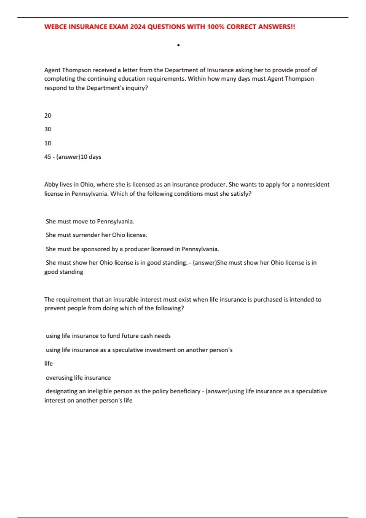 ,WEBCE INSURANCE EXAM 2024 QUESTIONS WITH 100% CORRECT ANSWERS!!