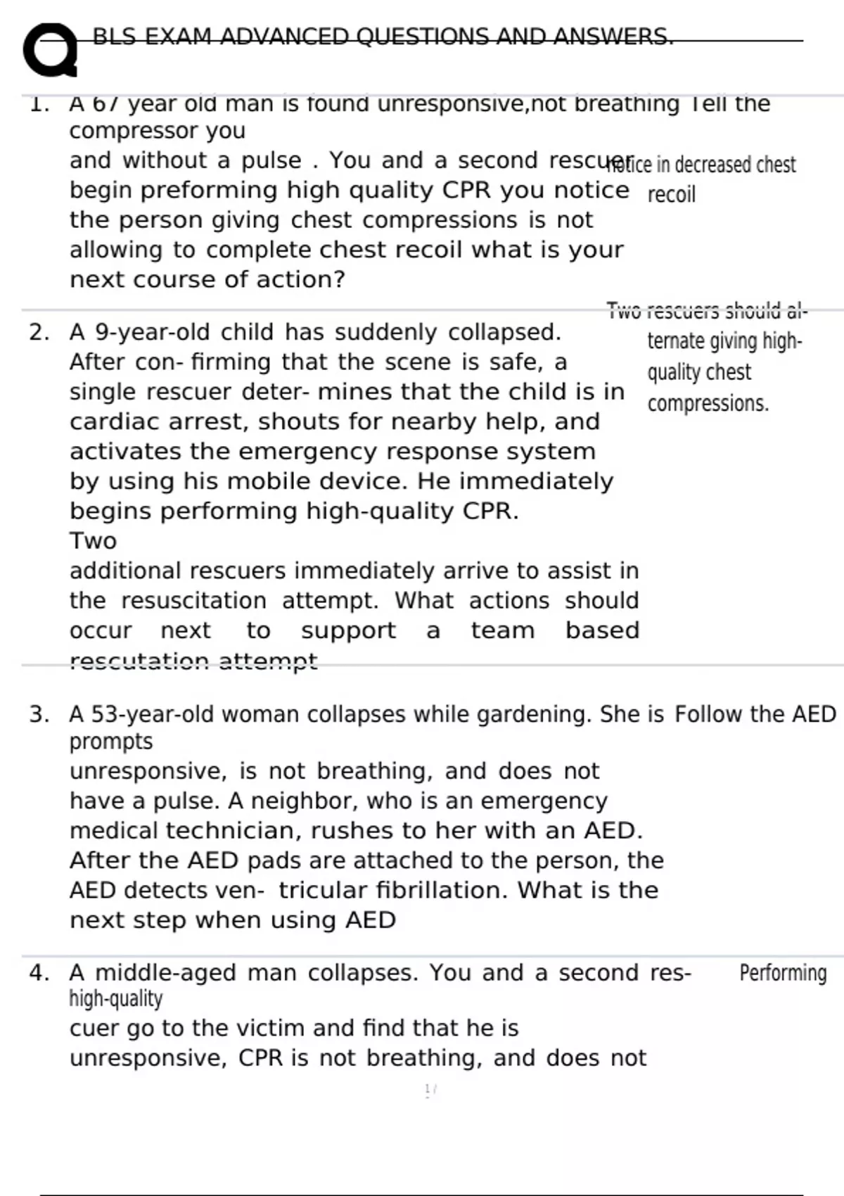 BLS EXAM ADVANCED QUESTIONS AND ANSWERS. 1. A 67 year old man is found unresponsive,not breathing Tell the compressor you and without a pulse . You and a second rescuer begin preforming high quality CPR you notice the person giving chest compressions is not allowing to complete chest recoil what is your next course of action? 2. A 9-year-old child has suddenly collapsed. After con- firming that the scene is safe, a single rescuer deter- mines that the child is in cardiac arrest, shouts for nearby help, and activates the emergency response system by using his mobile device. He immediately begins performing high-quality CPR. Two additional rescuers immediately arrive to assist in the resuscitation attempt. What actions should occur next to support a team based rescutation attempt notice in decreased chest recoil Two rescuers should al- ternate giving high-quality chest compressions. 3. A 53-year-old woman collapses while gardening. She is Follow the AED prompts unresponsive, is not breathing, and does not have a pulse. A neighbor, who is an emergency medical technician, rushes to her with an AED. After the AED pads are attached to the person, the AED detects ven- tricular fibrillation. What is the next step when using AED 4. A middle-aged man collapses. You and a second res- Performing high-quality cuer go to the victim and find that he is unresponsive, CPR is not breathing, and does not have a pulse. Which action is most likely to positively impact his survival? 5. Start CPR, beginning with chest compressions