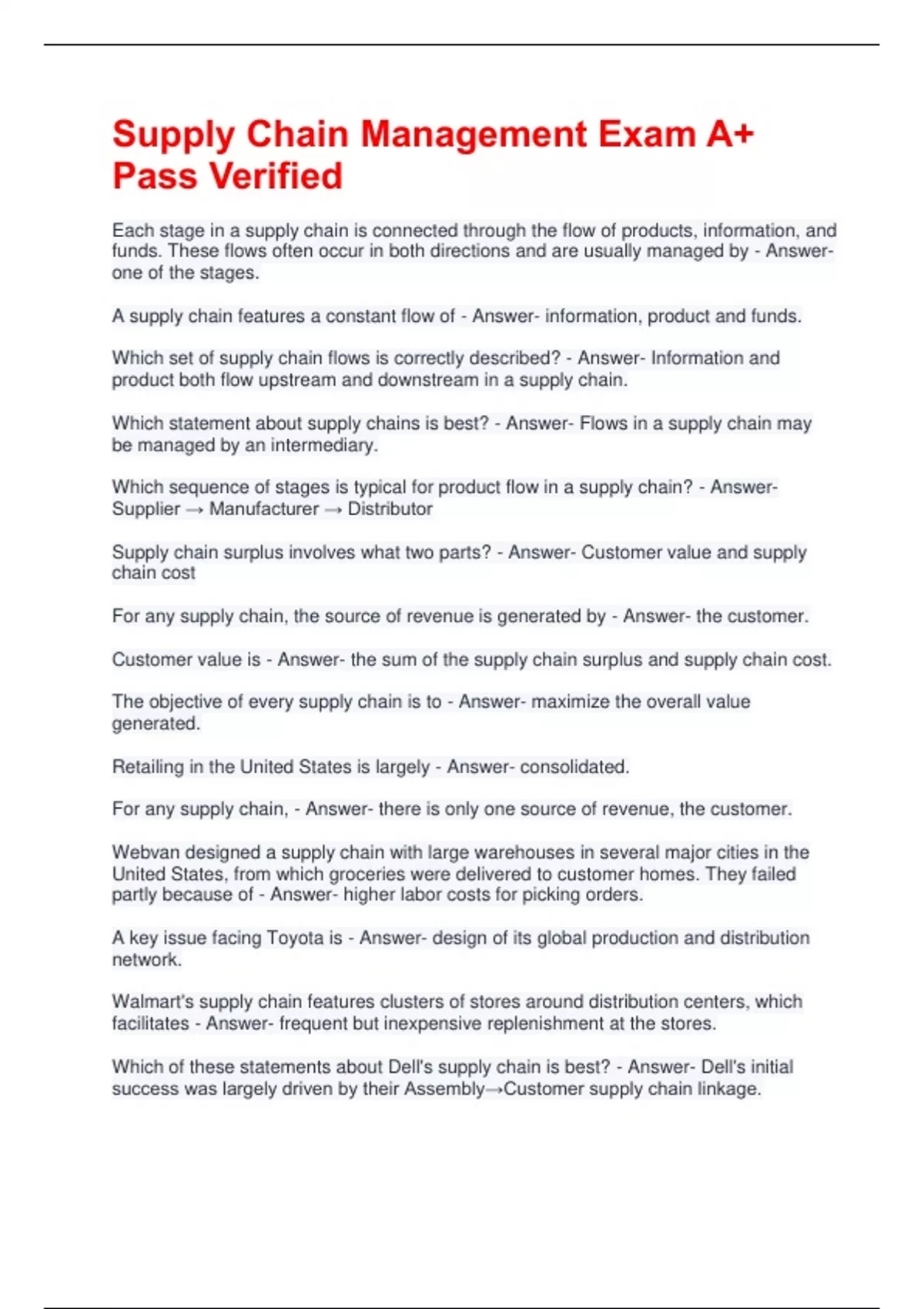 For any supply chain, the source of revenue is generated by - Answer- the customer.