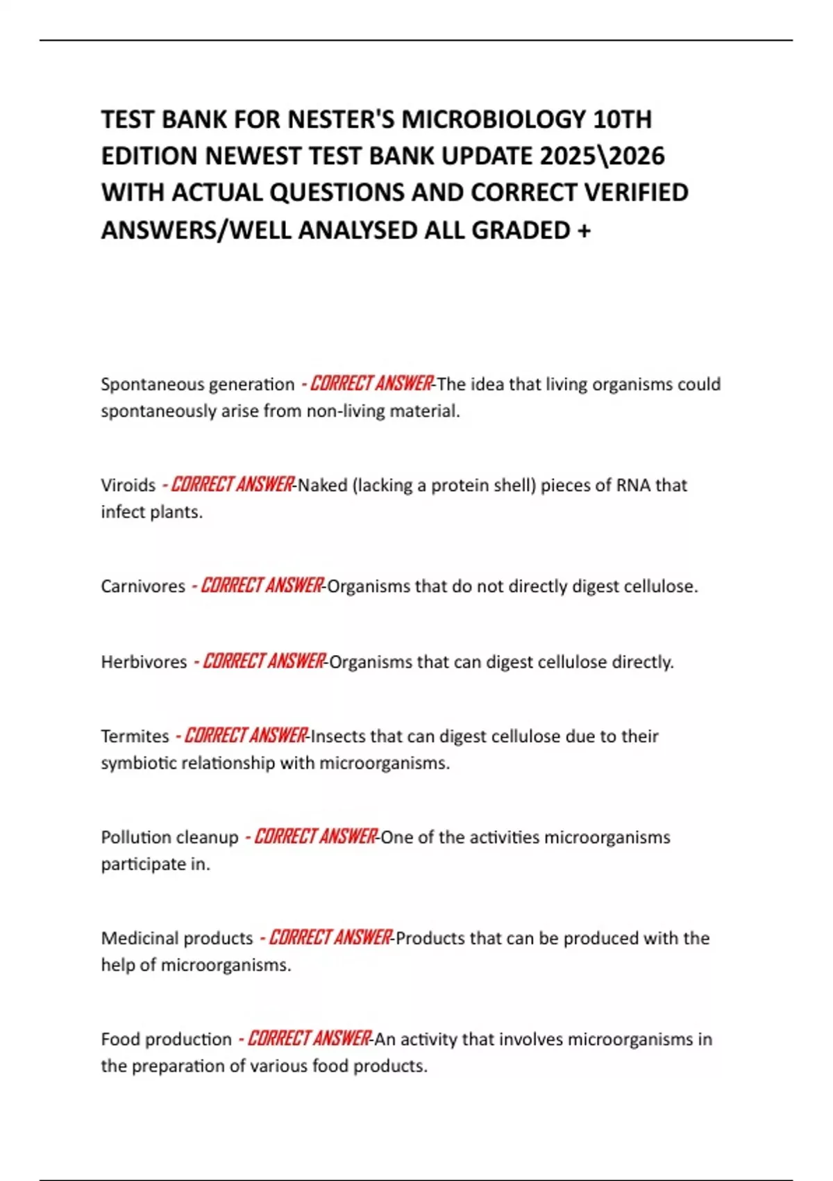 TEST BANK FOR NESTER'S MICROBIOLOGY 10TH