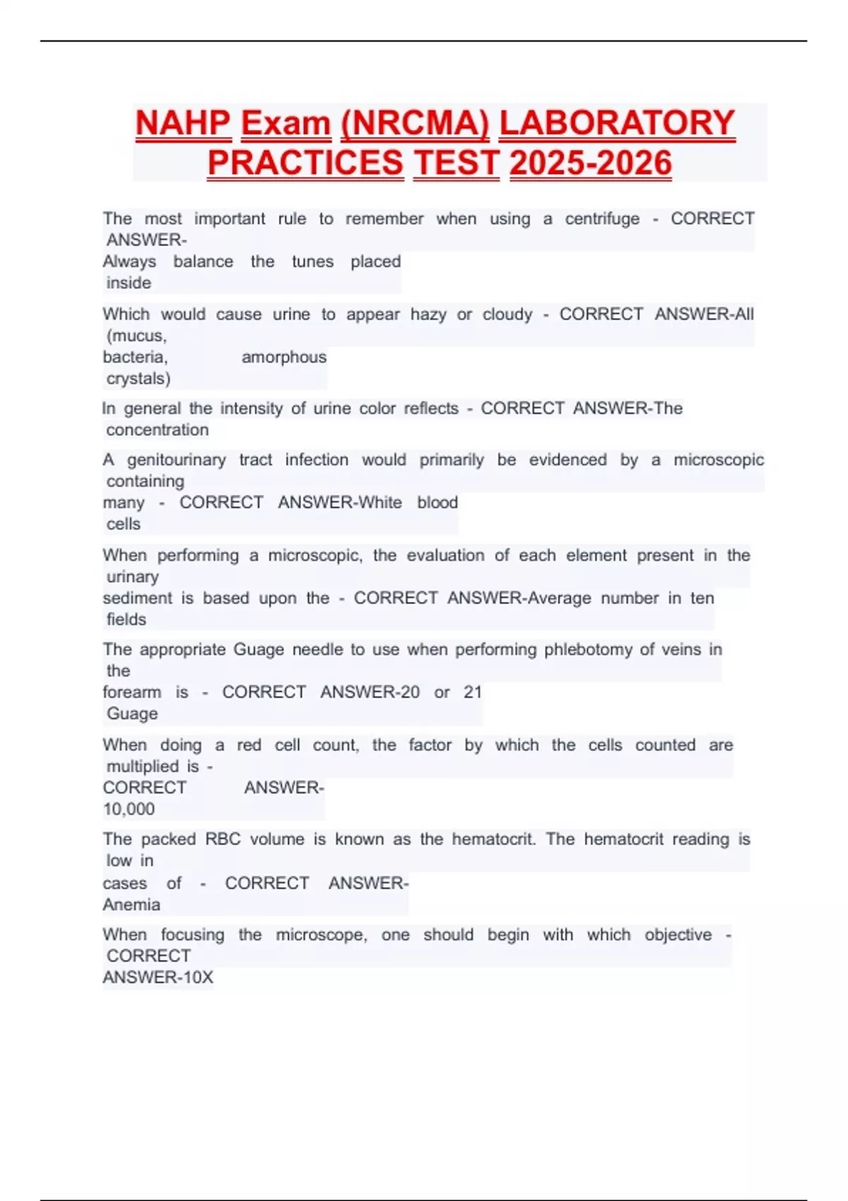 NAHP Exam (NRCMA) LABORATORY PRACTICES TEST NAHP Exam (NRCMA) LABORATORY PRACTICES TEST NAHP Exam (NRCMA) LABORATORY PRACTICES TEST NAHP Exam (NRCMA) LABORATORY PRACTICES TEST NAHP Exam (NRCMA) LABORATORY PRACTICES TEST