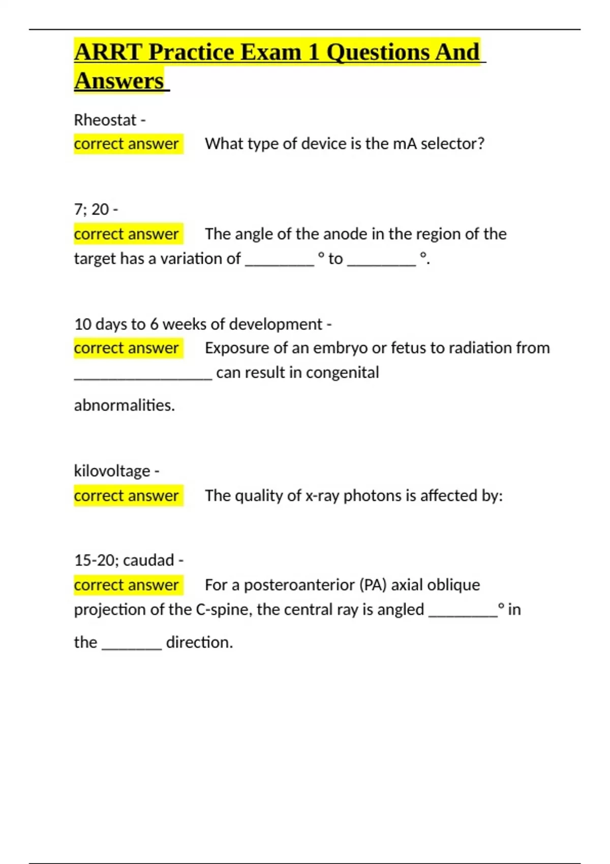 ,ARRT Practice Exam 1 Questions And
