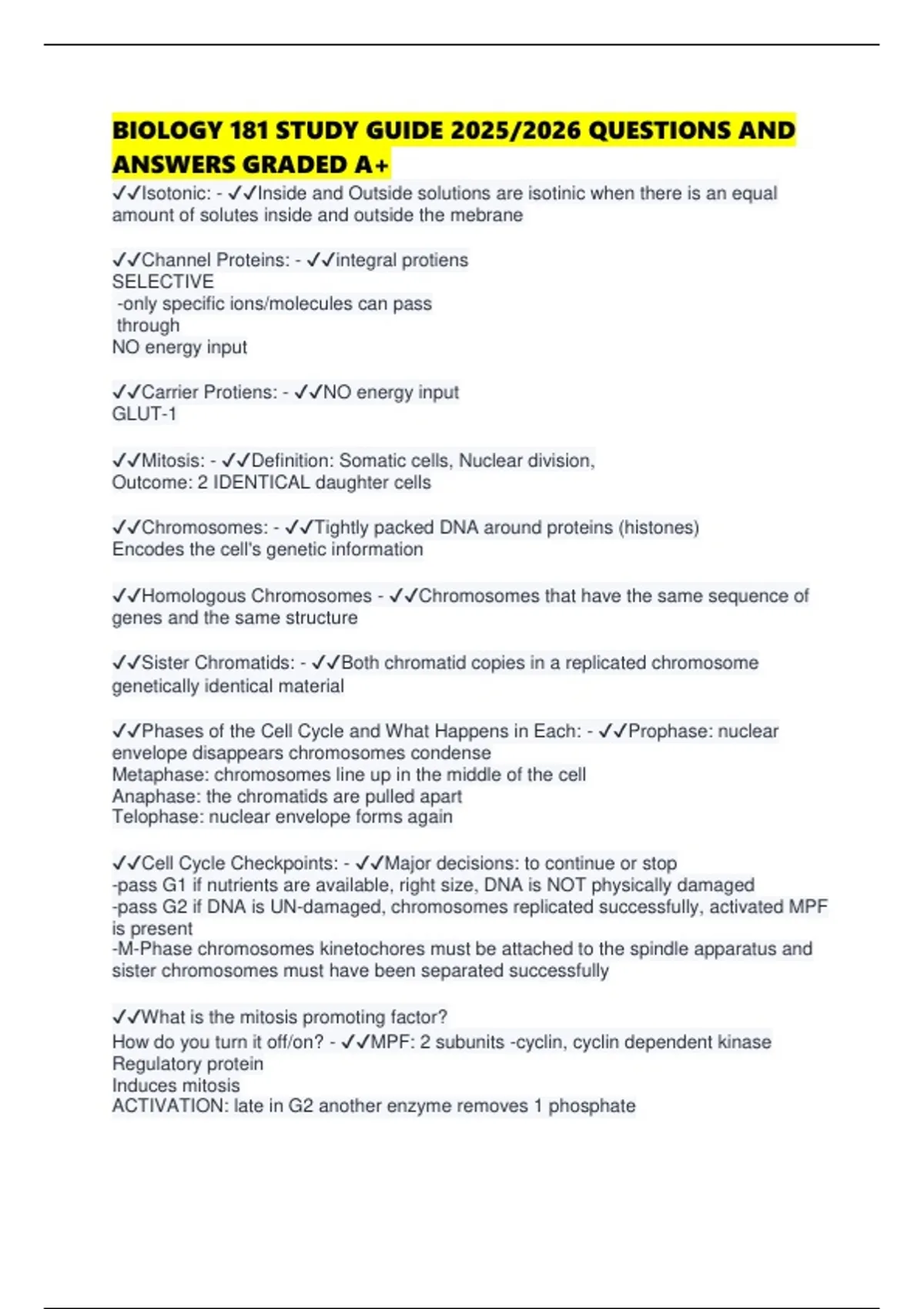 BIOLOGY 181 STUDY GUIDE 2025/2026 QUESTIONS AND ANSWERS GRADED A+